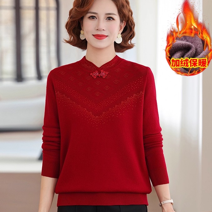 中老年秋冬装加绒毛衣洋气一体绒上衣中老年女装旗袍领保暖打底衫