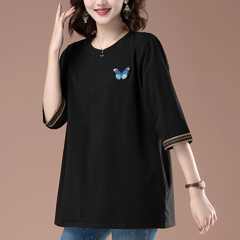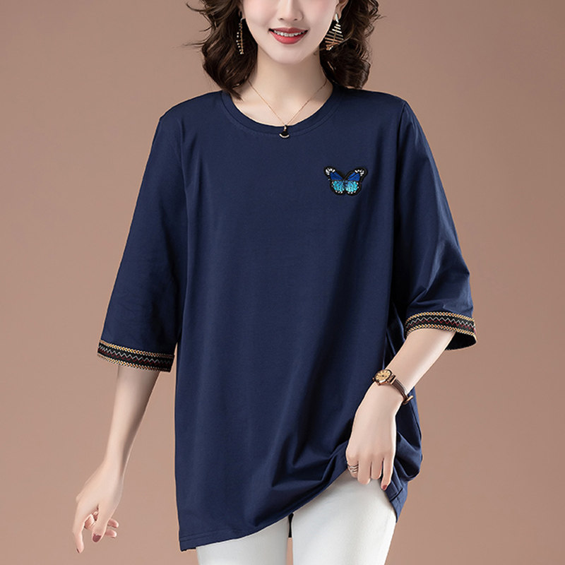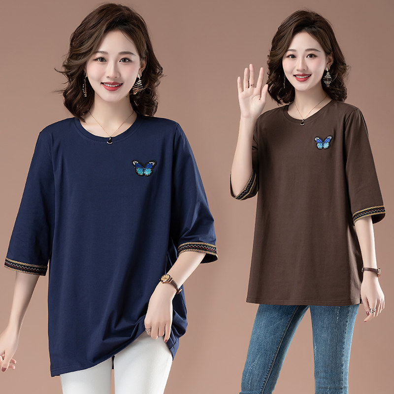 短袖t恤女宽松大码女装纯棉中袖上衣中年妈妈夏装遮肚子洋气小衫