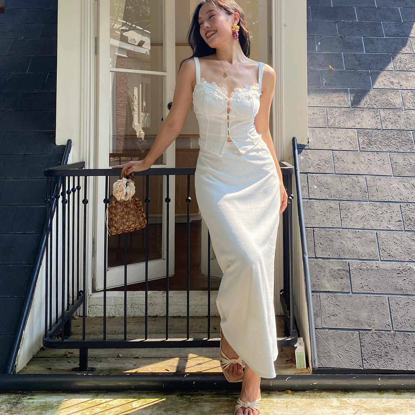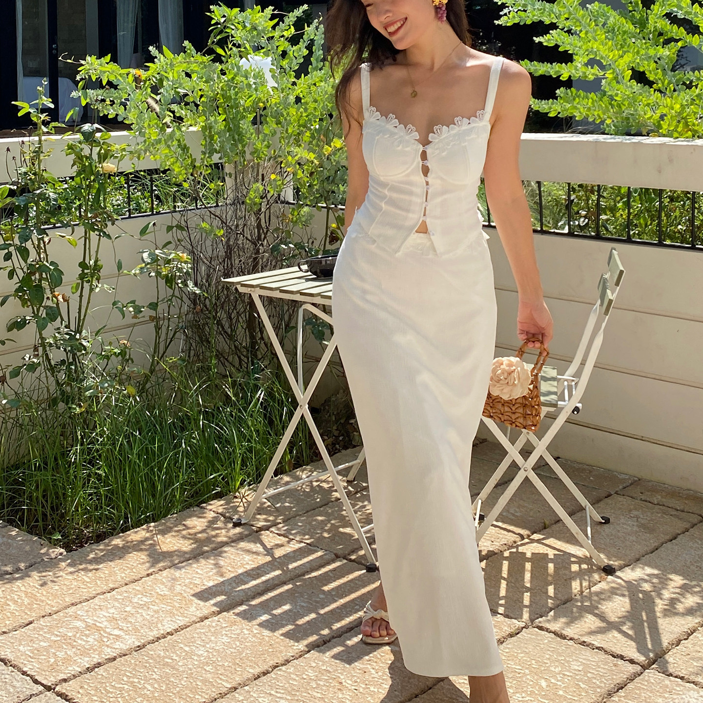 oohitch痒痒 法式蕾丝花边拼接白色吊带背心气质连衣裙两件套装