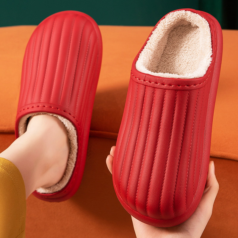 皮面棉拖鞋女冬季保暖一体防滑包头情侣地板室内居家用可爱月子鞋