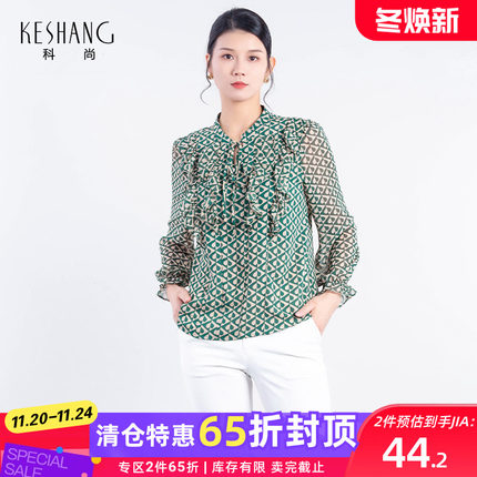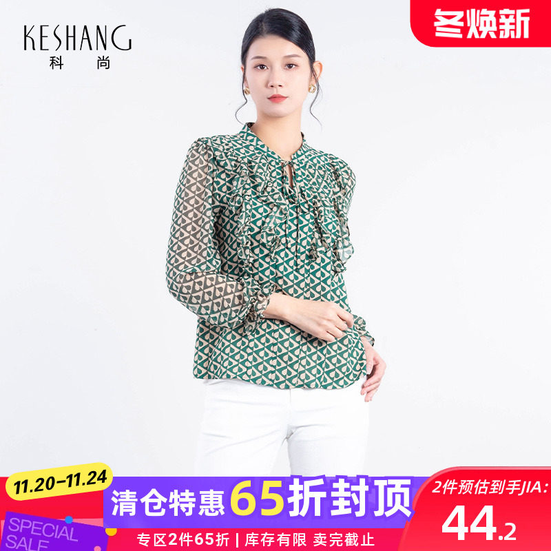 科尚2025春季新款长袖衬衫女士宽松显瘦上衣时尚印花雪纺套头衬衣