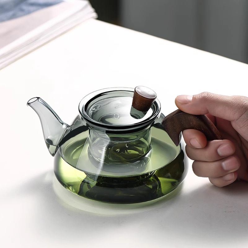 泡茶壶茶壶泡茶家用高硼硅玻璃茶水分离煮茶壶烟灰色胡桃木把手