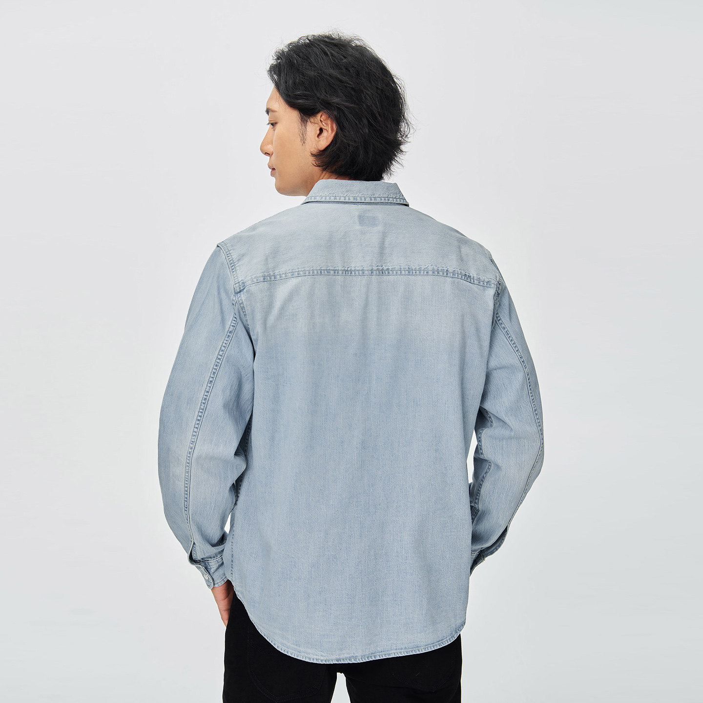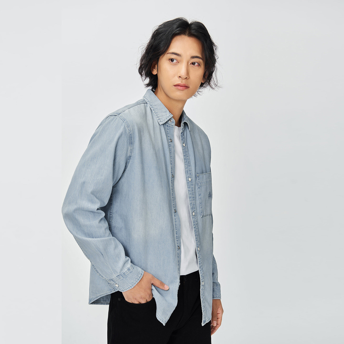 Lee商场同款舒适版翻领小三角Logo浅蓝男长袖牛仔衬衫