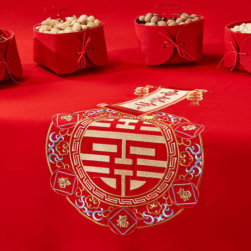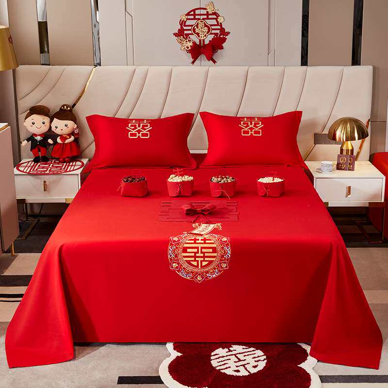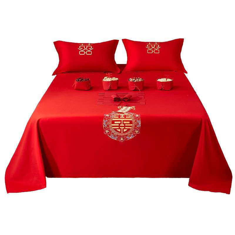红床单结婚单件新婚婚房双人加大中式刺绣床上用品被单枕套三件套