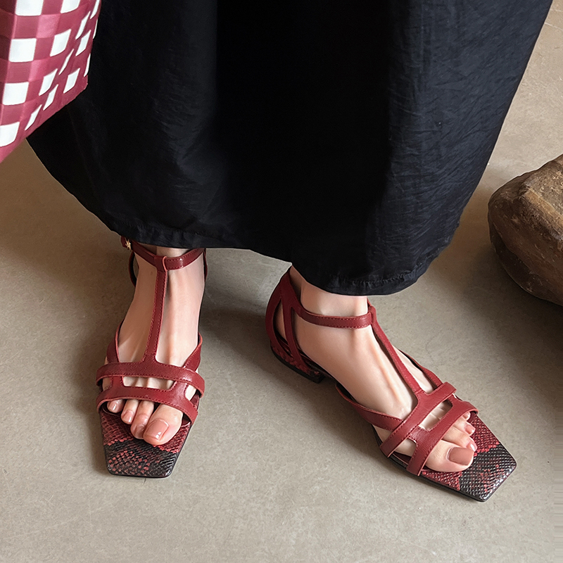 度假氛围感羊皮/2cm设计师款蛇纹方头露趾凉鞋女欧美风粗跟时装鞋
