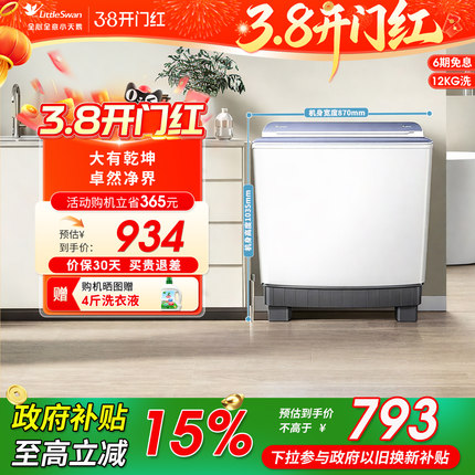 【净魔方】小天鹅12KG大容量双桶双缸半自动洗衣机波轮TP12S156