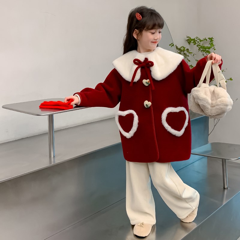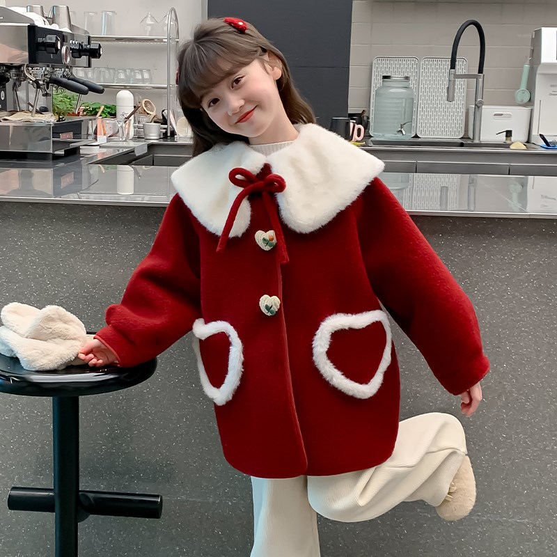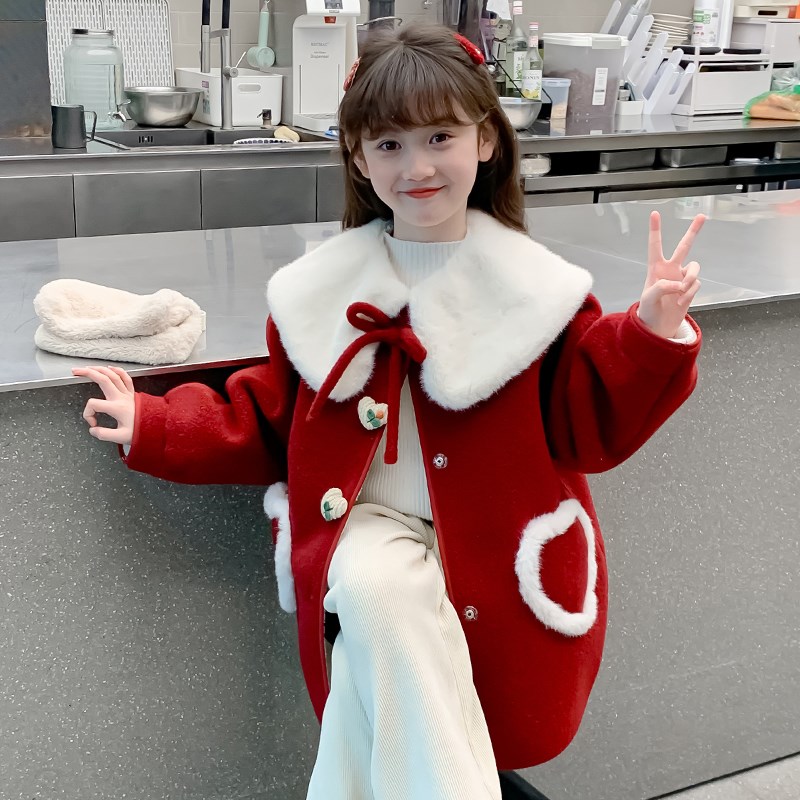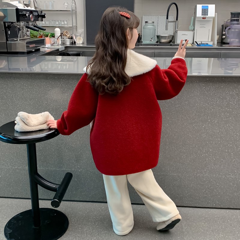女童加绒外套秋冬款儿童冬季加厚红色毛呢子大衣女孩新年拜年衣服