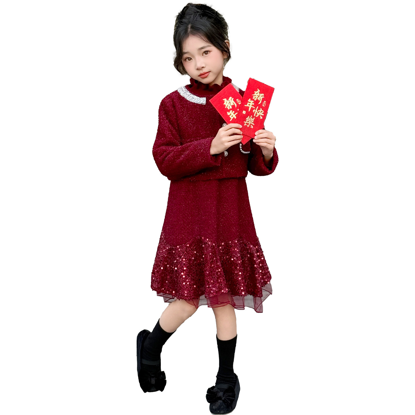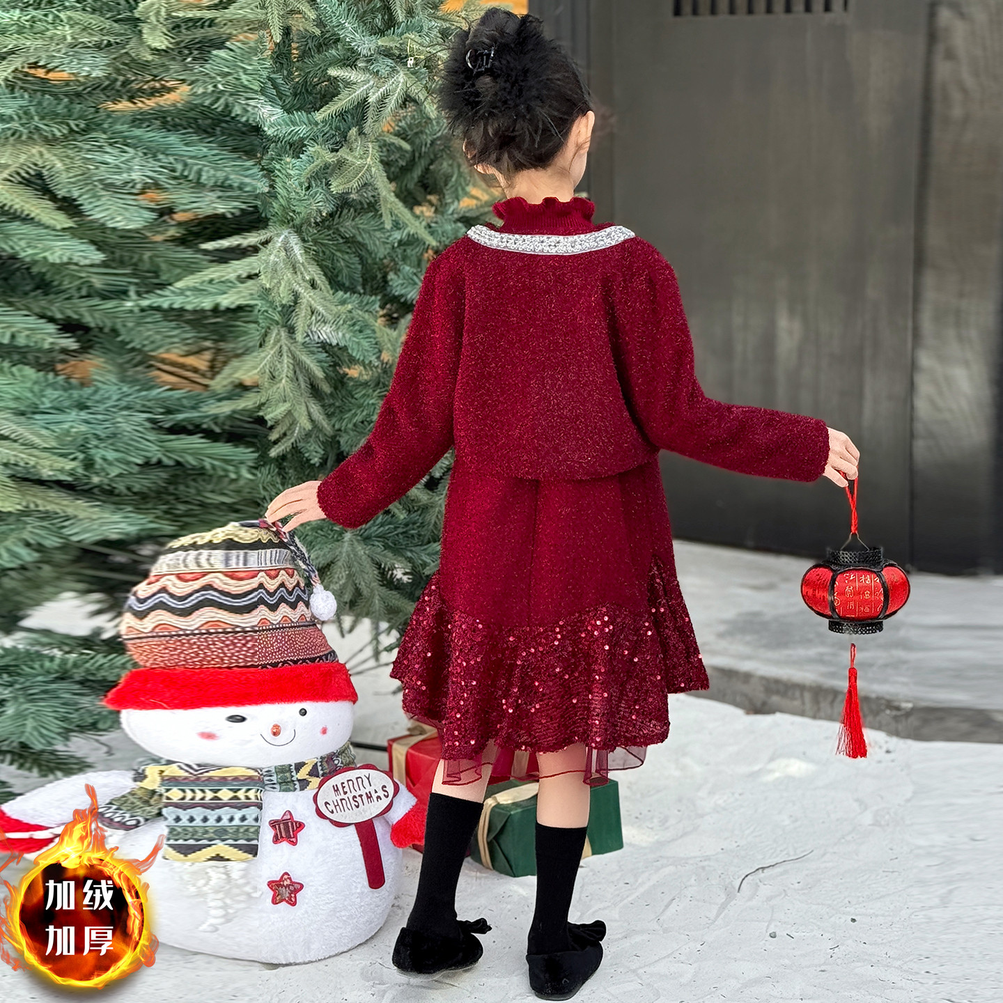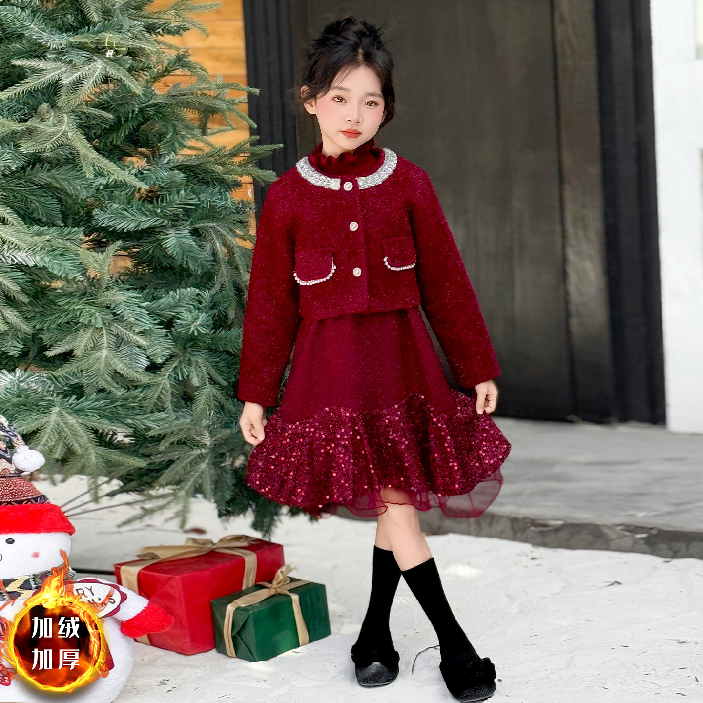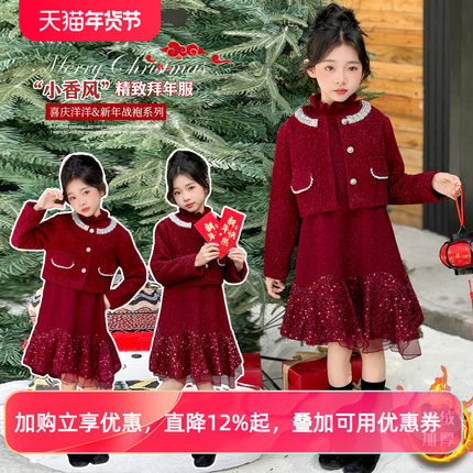 女童连衣裙秋冬儿童红色新年加绒公主裙女孩小香风外套裙子三件套
