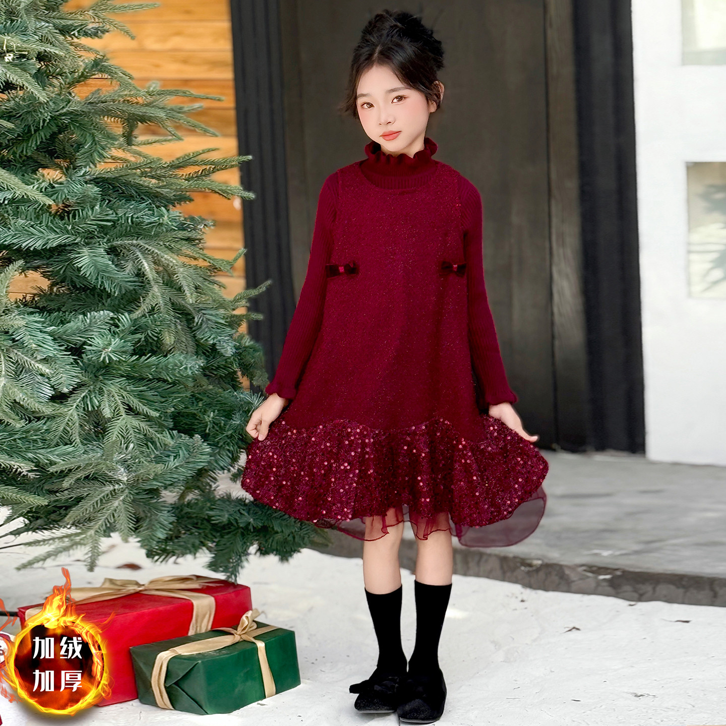 女童连衣裙秋冬款红色小香风裙子