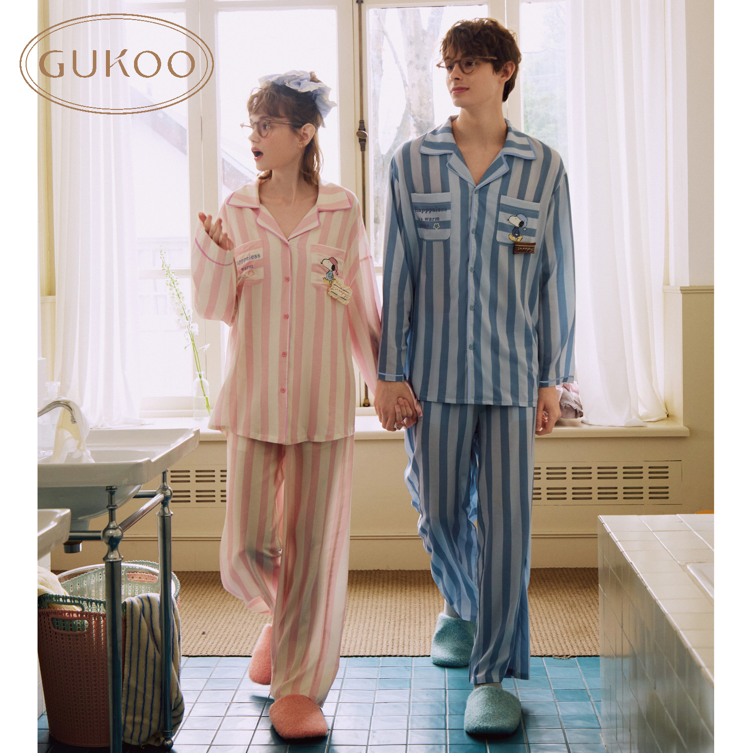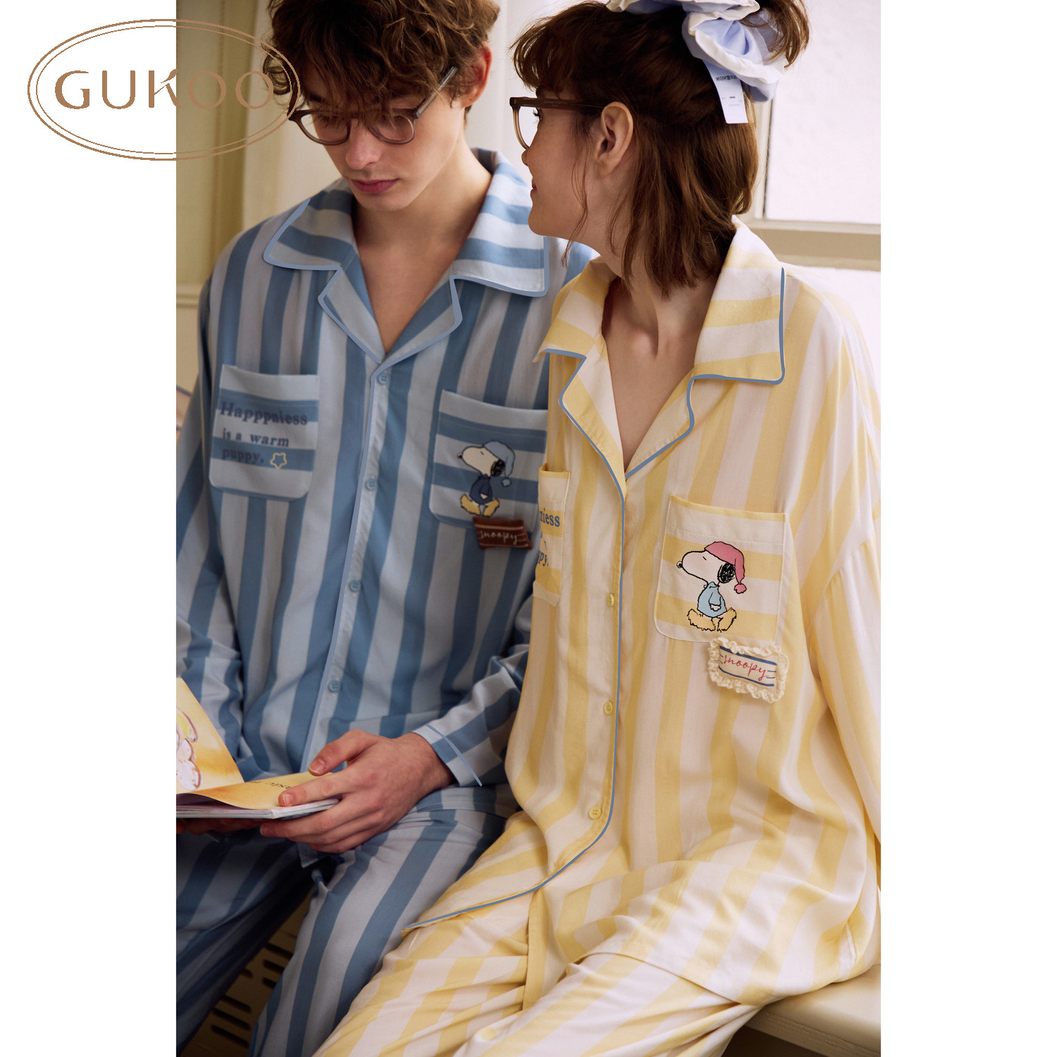 Gukoo/果壳情侣睡衣春秋款史努比联名新款条纹天丝女家居服套装A