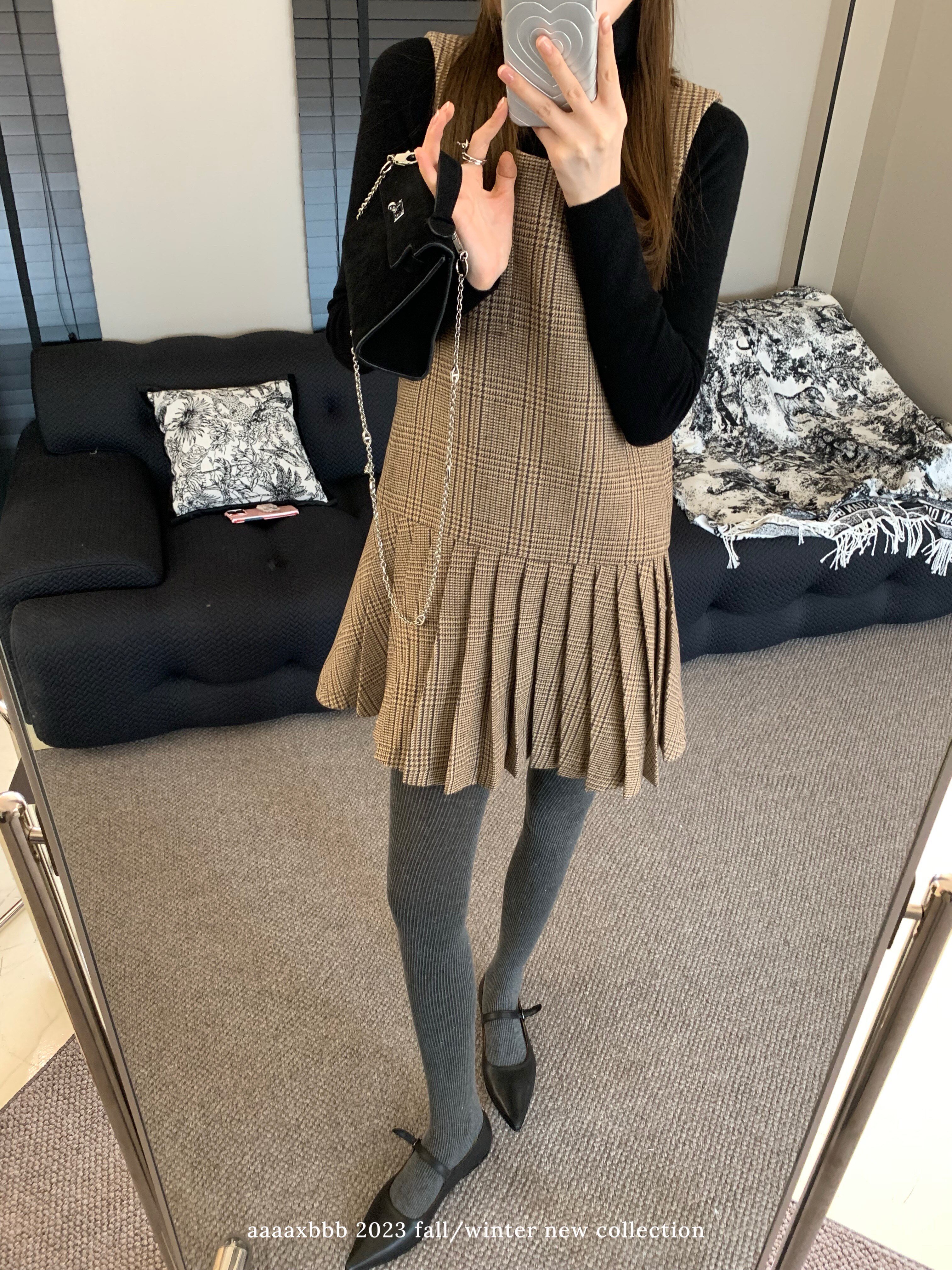 aaaaxbbb 塔塔的花店 格纹背心裙羊毛连衣裙百褶时尚休闲毛呢短裙