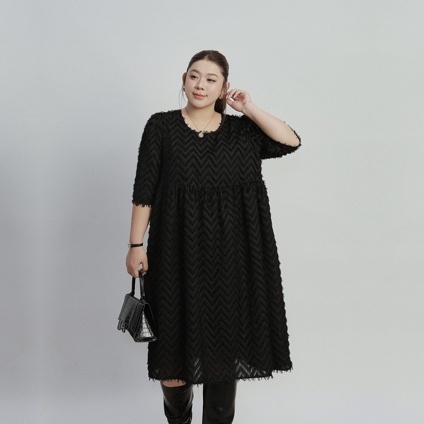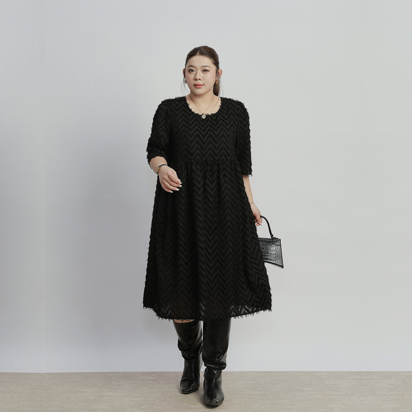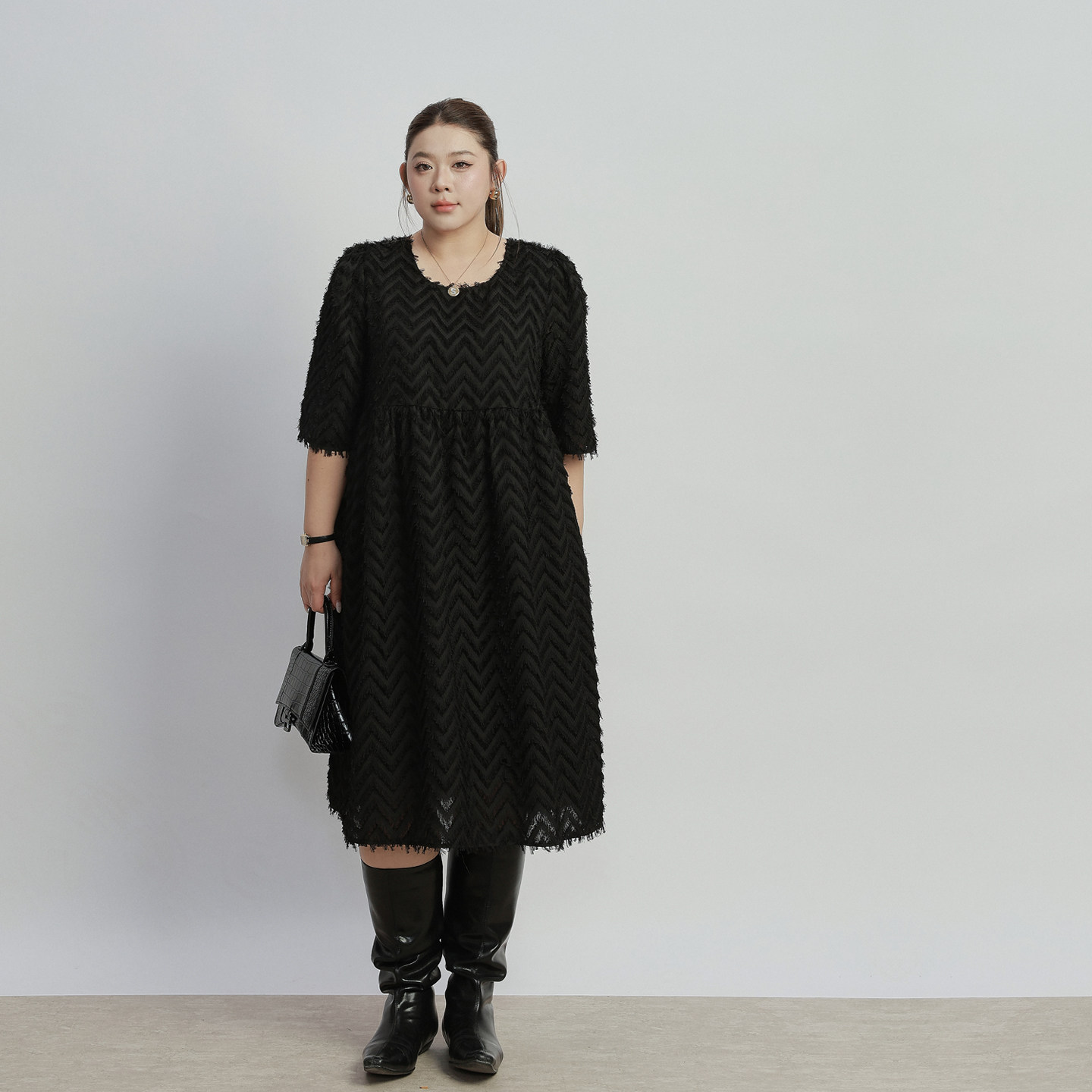 2026年春装新款大码女装胖mm宽松显瘦遮肚睫毛波浪a字连衣裙200斤