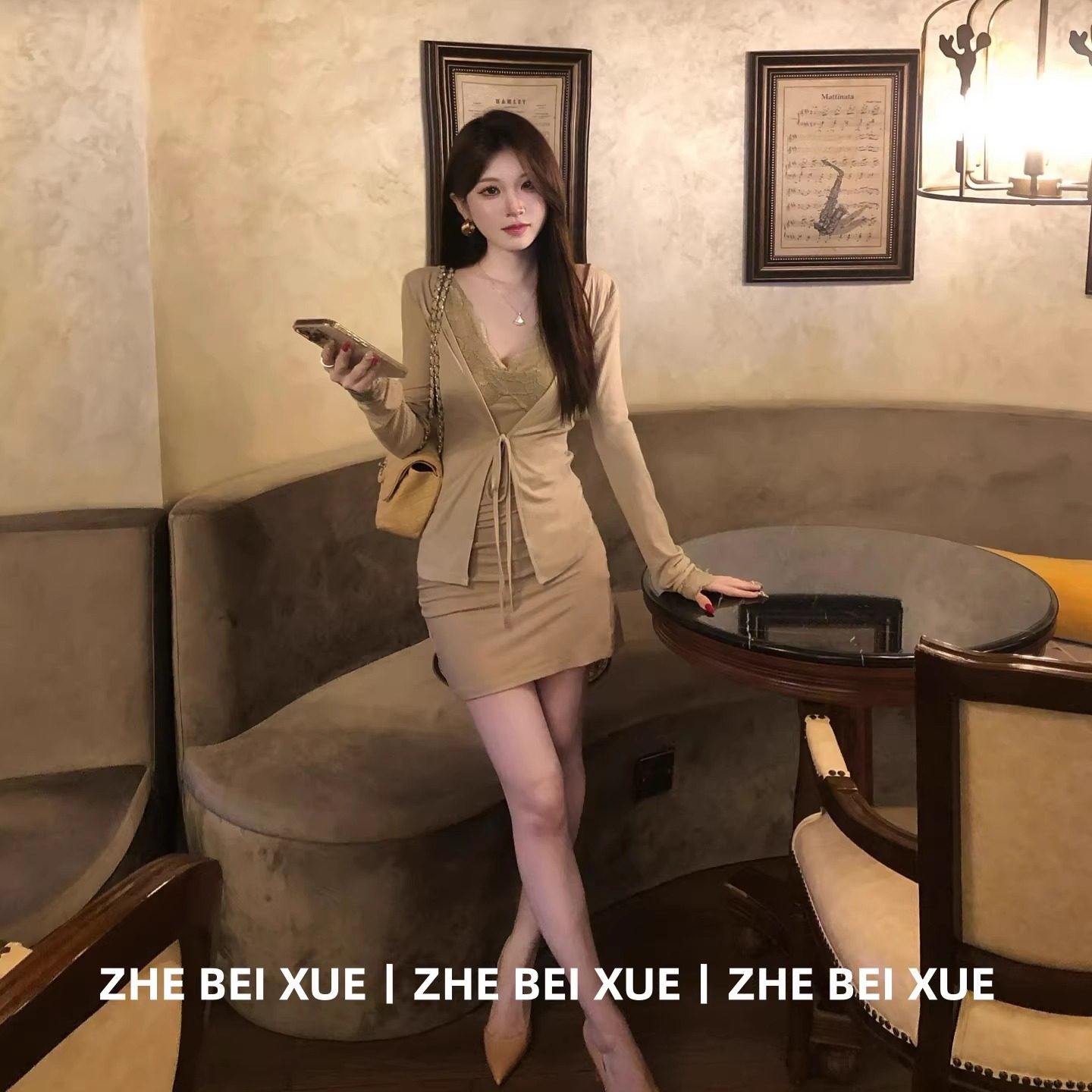 套装女性感纯欲风长袖外套蕾丝吊带包臀连衣裙独特漂亮冬装一整套