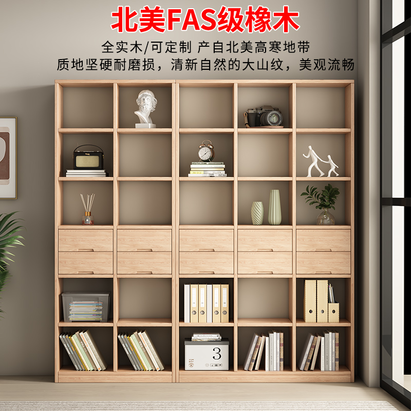 实木橡木书架落地置物架一体整墙格子柜儿童书柜储物柜定制展示柜