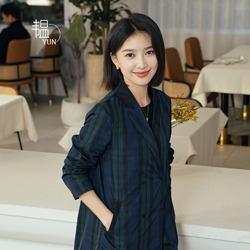 【YUN】韫2024秋季新品女日韩经典西装领双排扣长款格子风衣外套