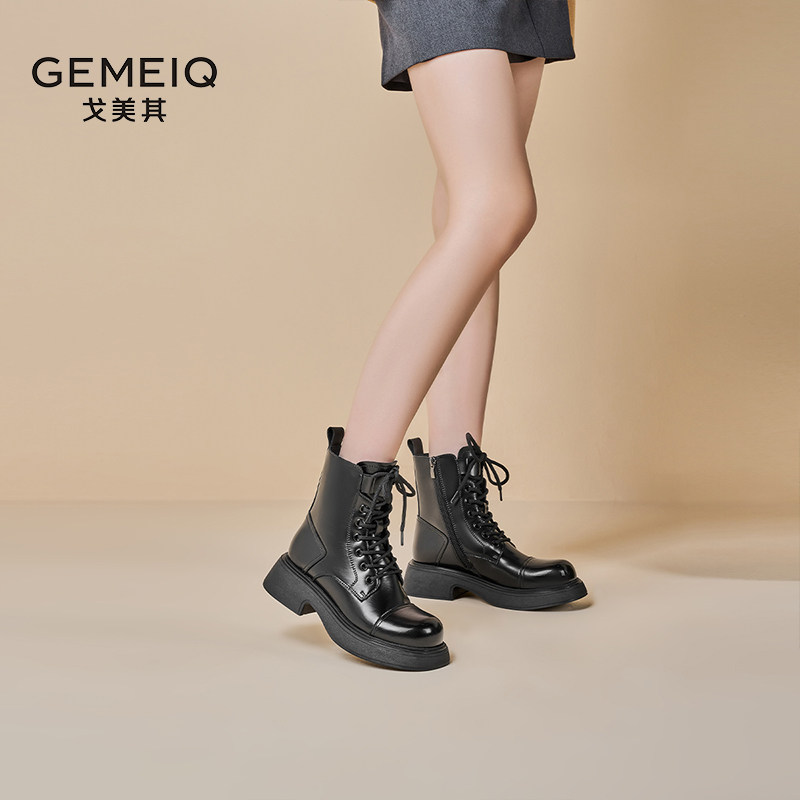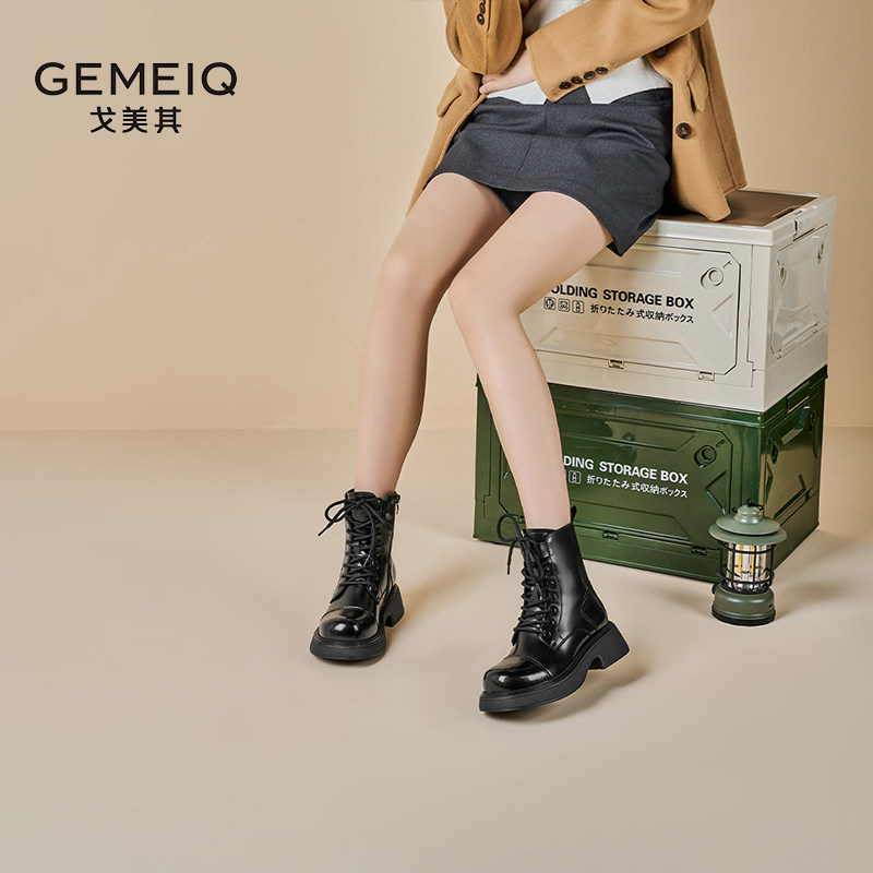戈美其厚底马丁靴女舒适春季新款漆皮瘦瘦单靴英伦风增高黑色短靴