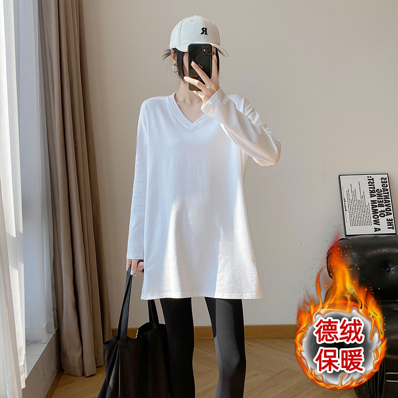 2025秋冬季新款V领显瘦遮肉中长款德绒宽松长袖上衣下衣失踪T恤女