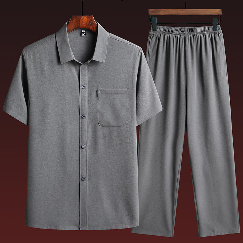 爸爸夏装套装唐装男中老年短袖衬衫夏季薄款父亲衬衣老人衣服爷爷