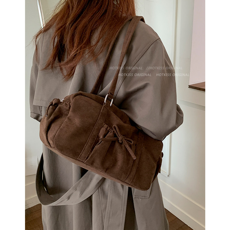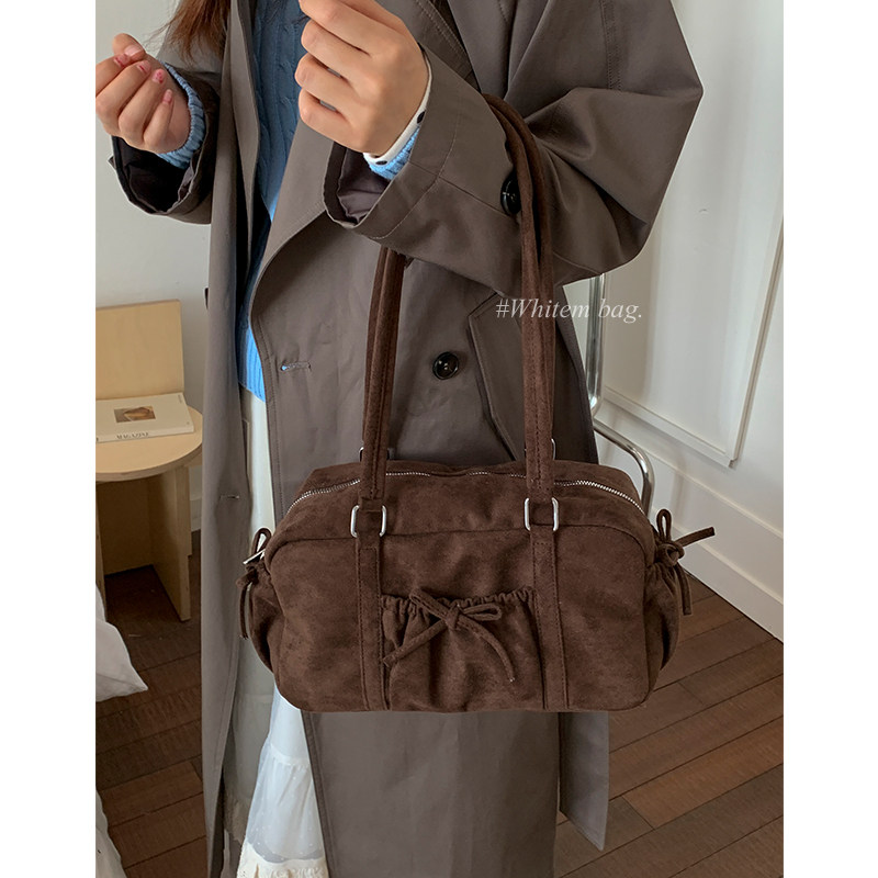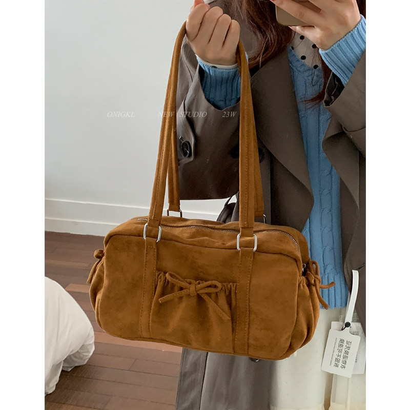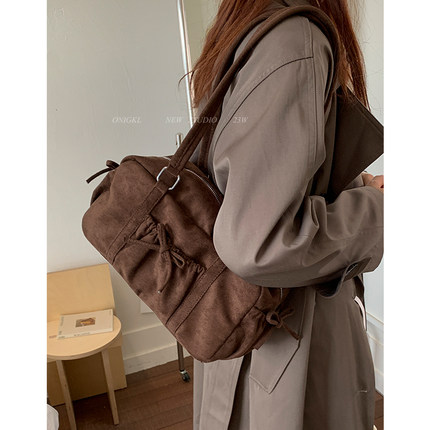 复古通勤麂皮绒包包女2025新款秋冬单肩包韩系棕色大容量波士顿包