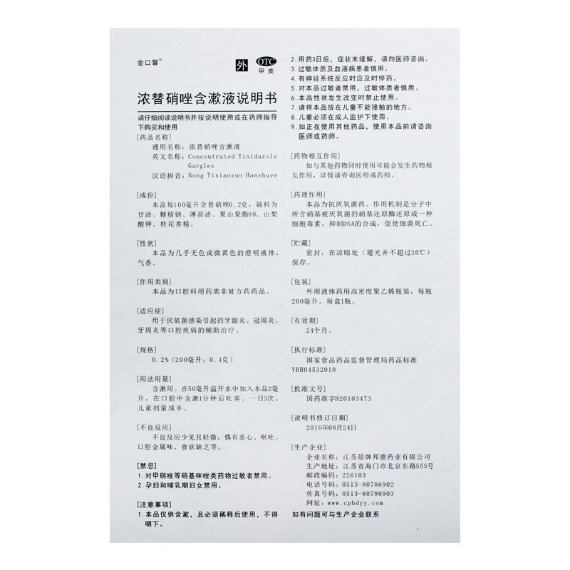 金口馨浓替硝唑含漱液晨牌邦德牙周炎厌氧菌医用杀菌口臭冠周炎