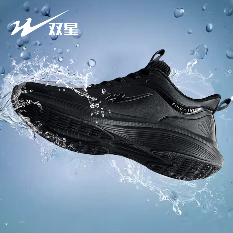 双星运动鞋男款春秋2025年新款男士皮面防水跑步鞋户外黑色工作鞋