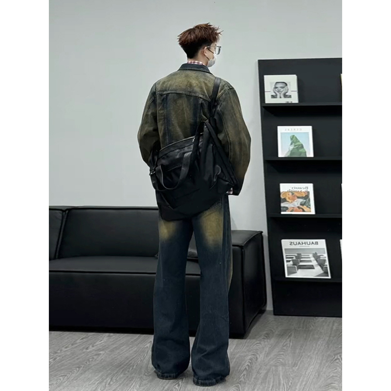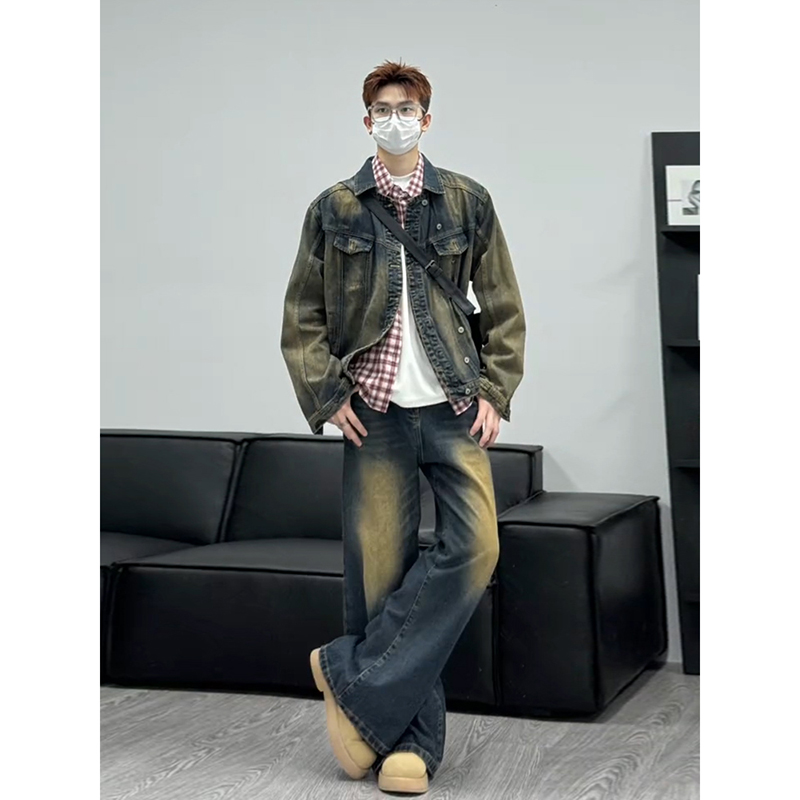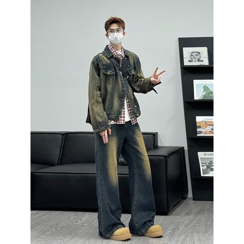 黄泥色牛仔外套长裤子两件套装男