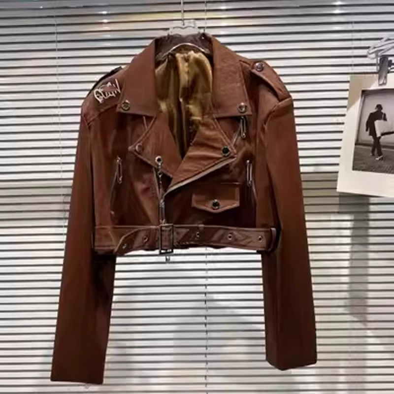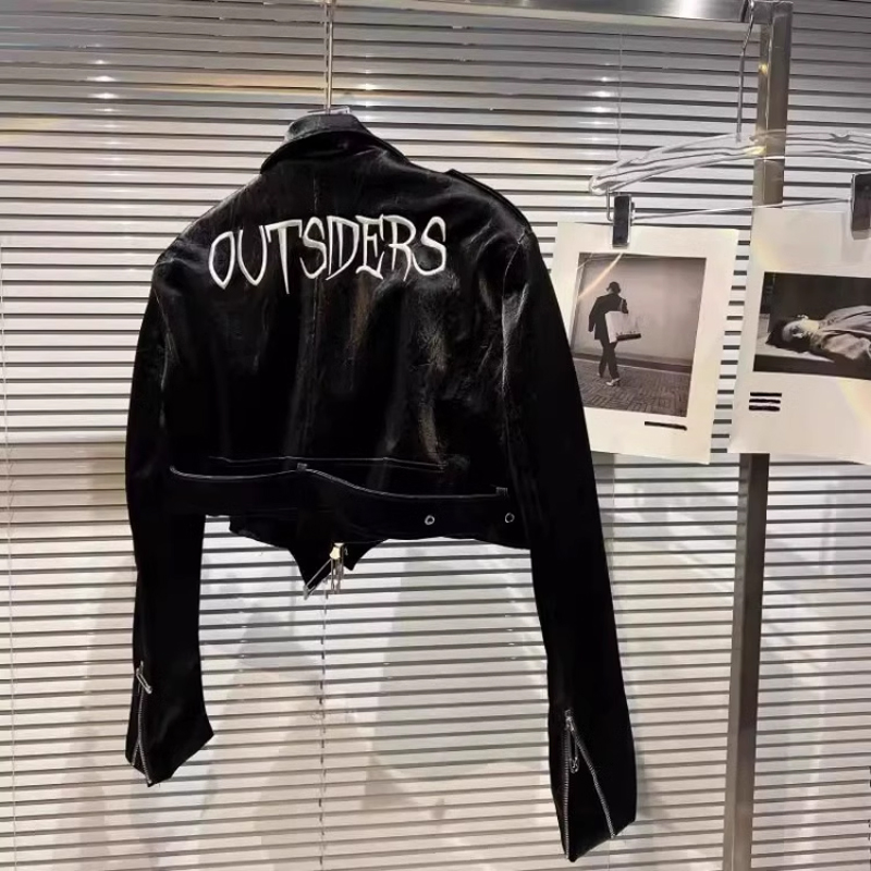 网红同款2025秋季新款机车辣妹字母刺绣荔枝皮亮面PU皮衣皮夹克女
