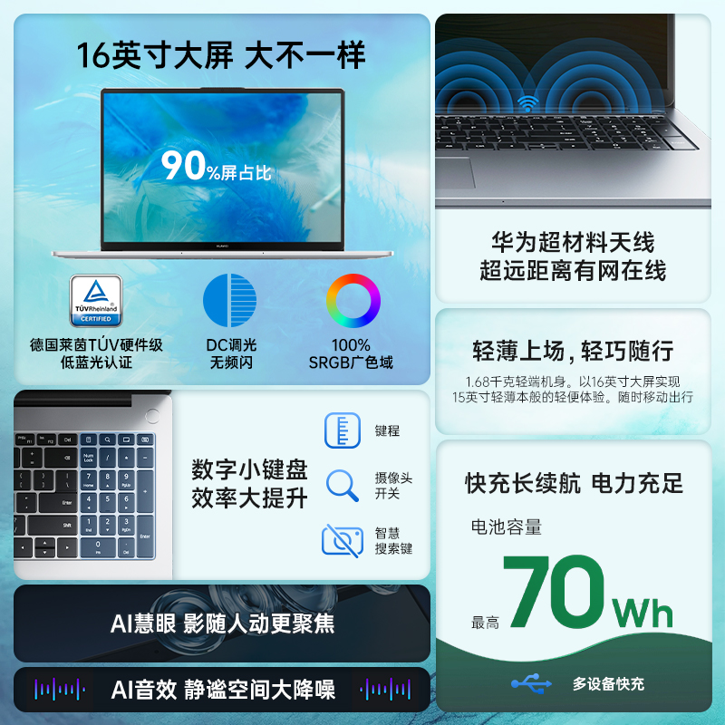 【国家补贴】华为MateBook D16 Linux版新品笔记本电脑13代酷睿标压学生学习商务办公高能轻薄本官方旗舰正品