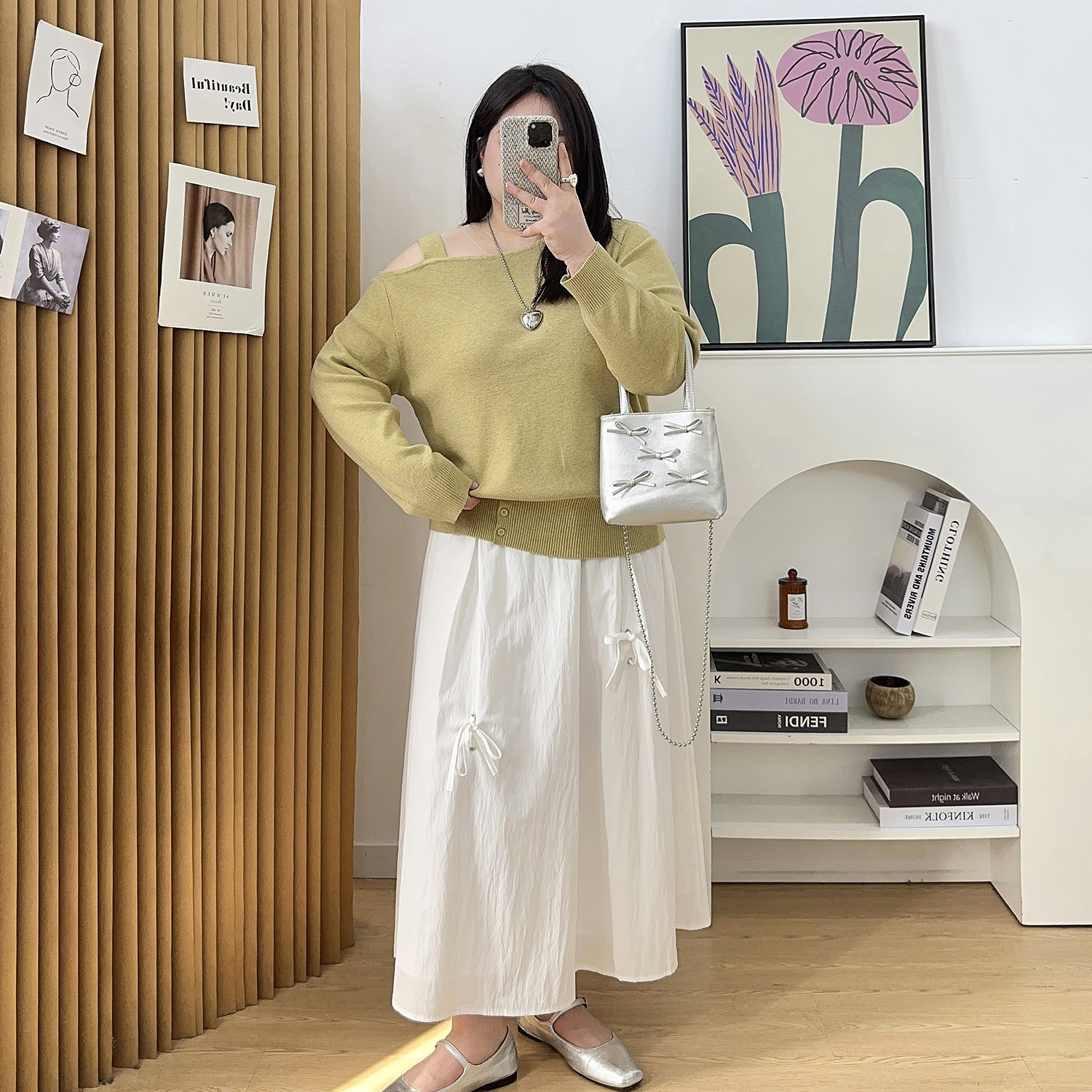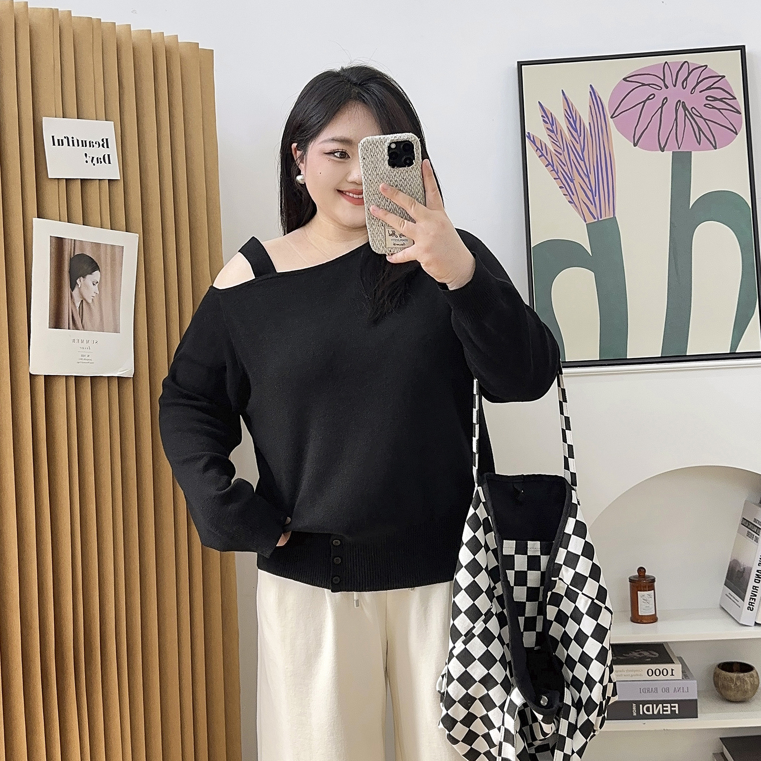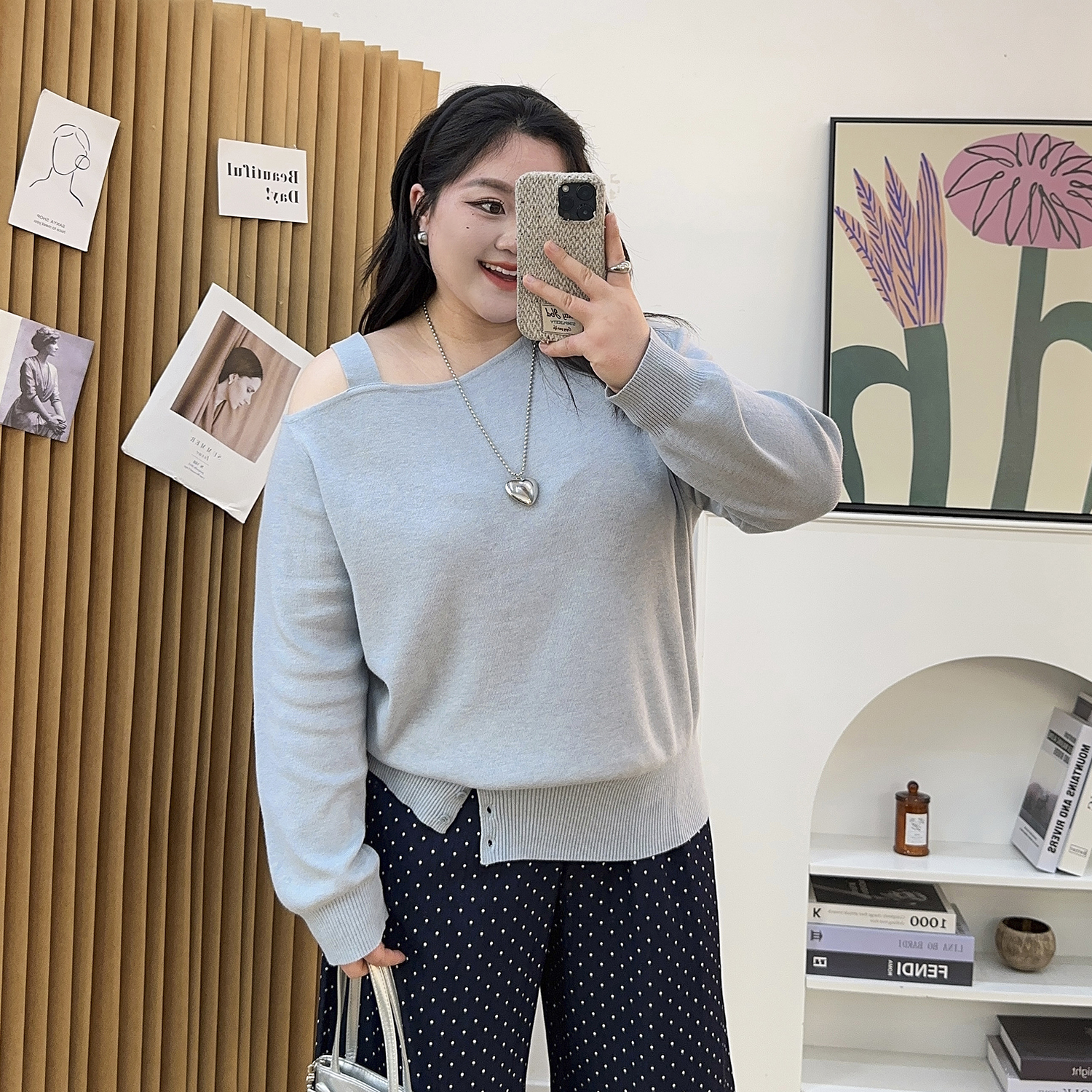大码设计感小众斜肩长袖针织衫春装胖mm遮肉显瘦不规则露肩上衣女