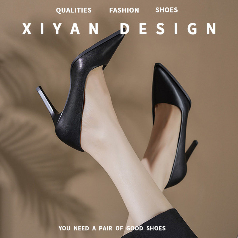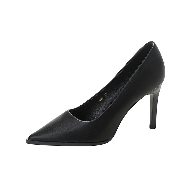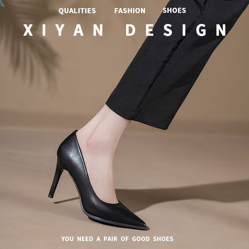 真皮高跟单鞋女尖头细跟面试鞋2023春款通勤黑色中跟职业工作鞋子