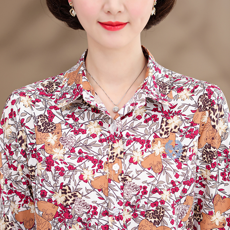 2023春季新款中老年女装纯棉衬衫翻领印花打底衫休闲薄款长袖上衣