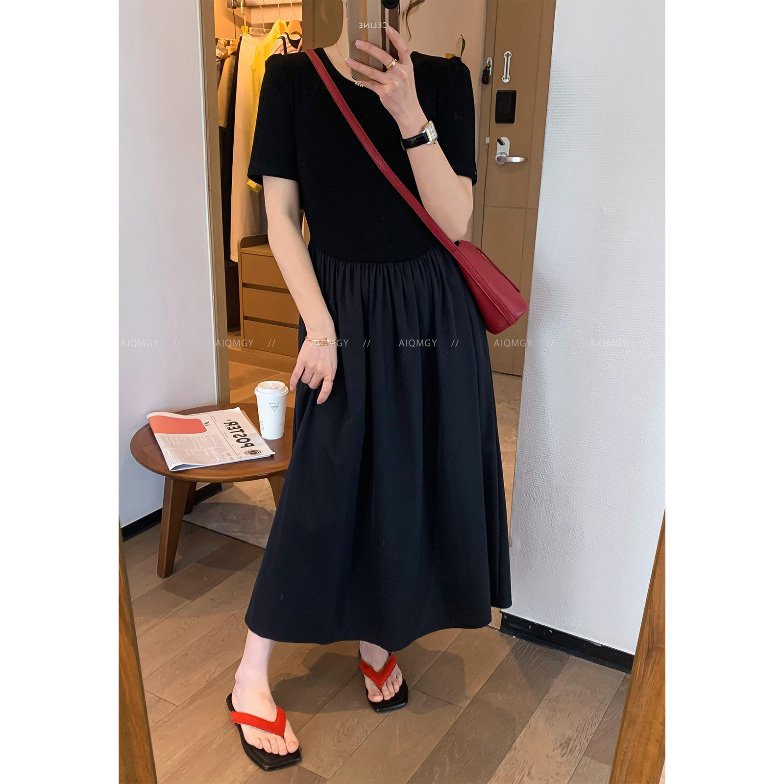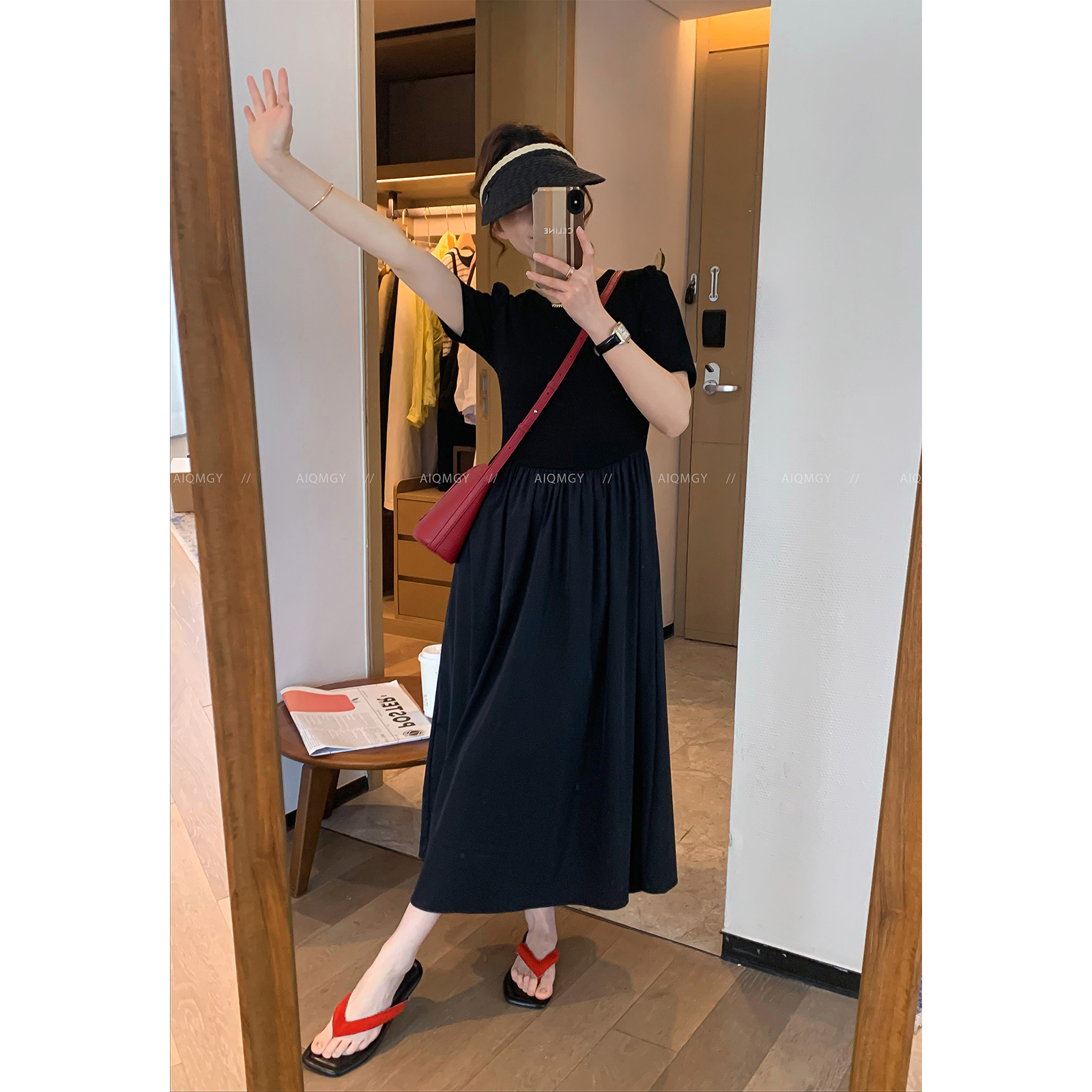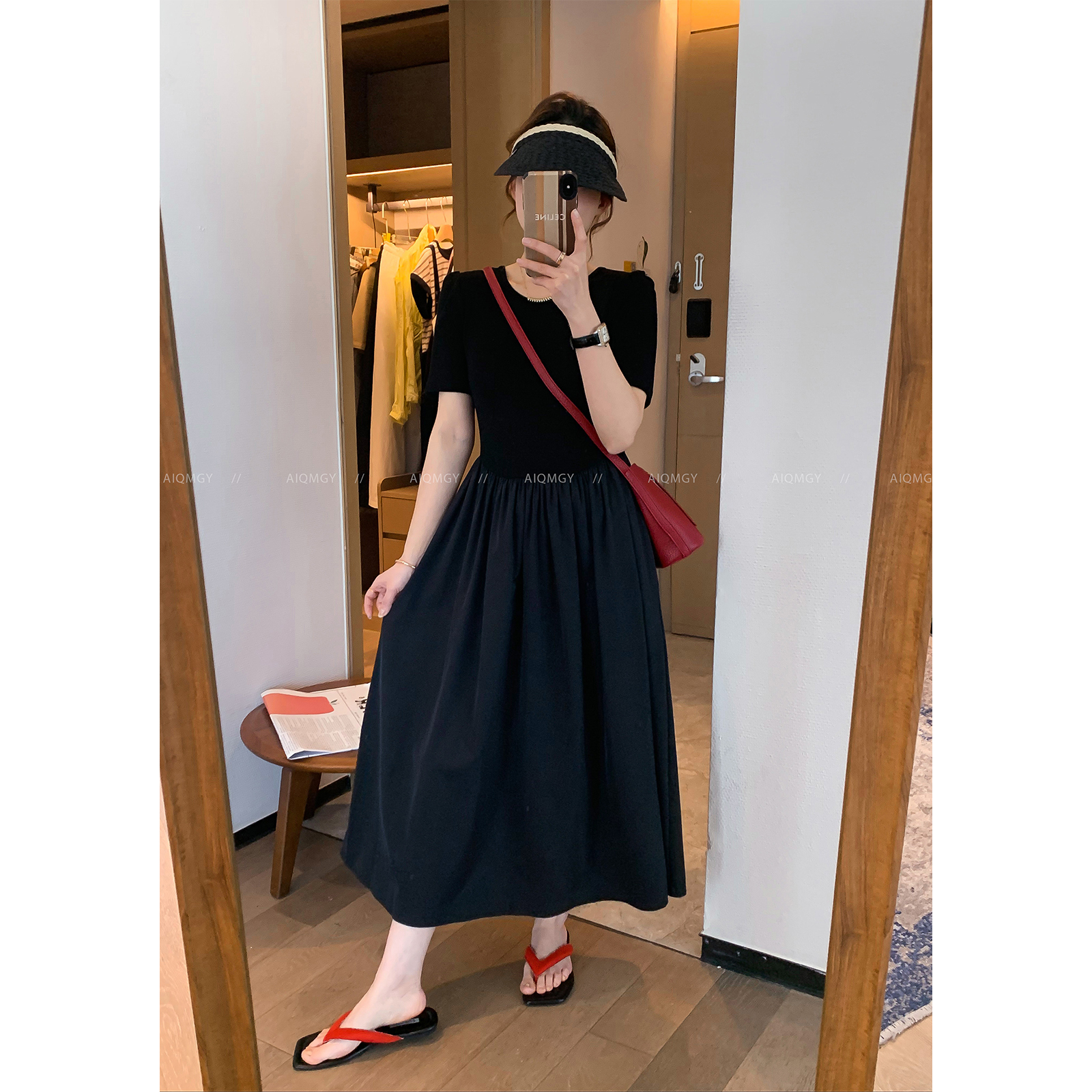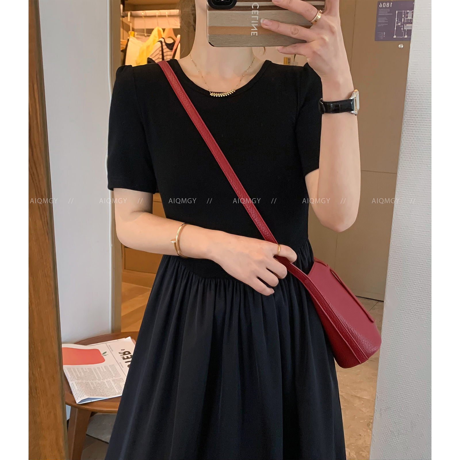 爱情魔鬼鱼 黑色圆领短袖露背连衣裙女2025夏季新款收腰显瘦长裙