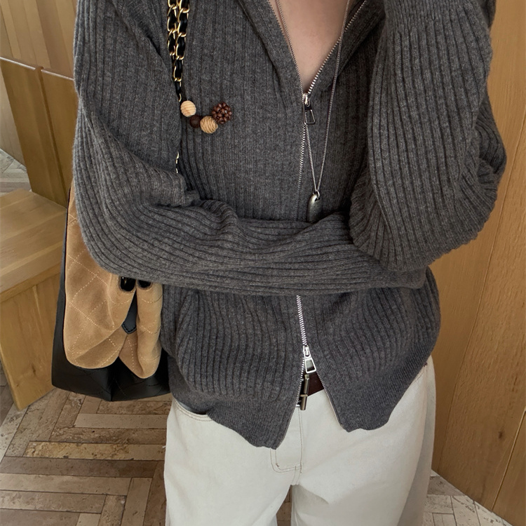 欧洲站2025秋季新款欧货纯色毛球胸针上下拉链羊毛针织开衫帽衫女