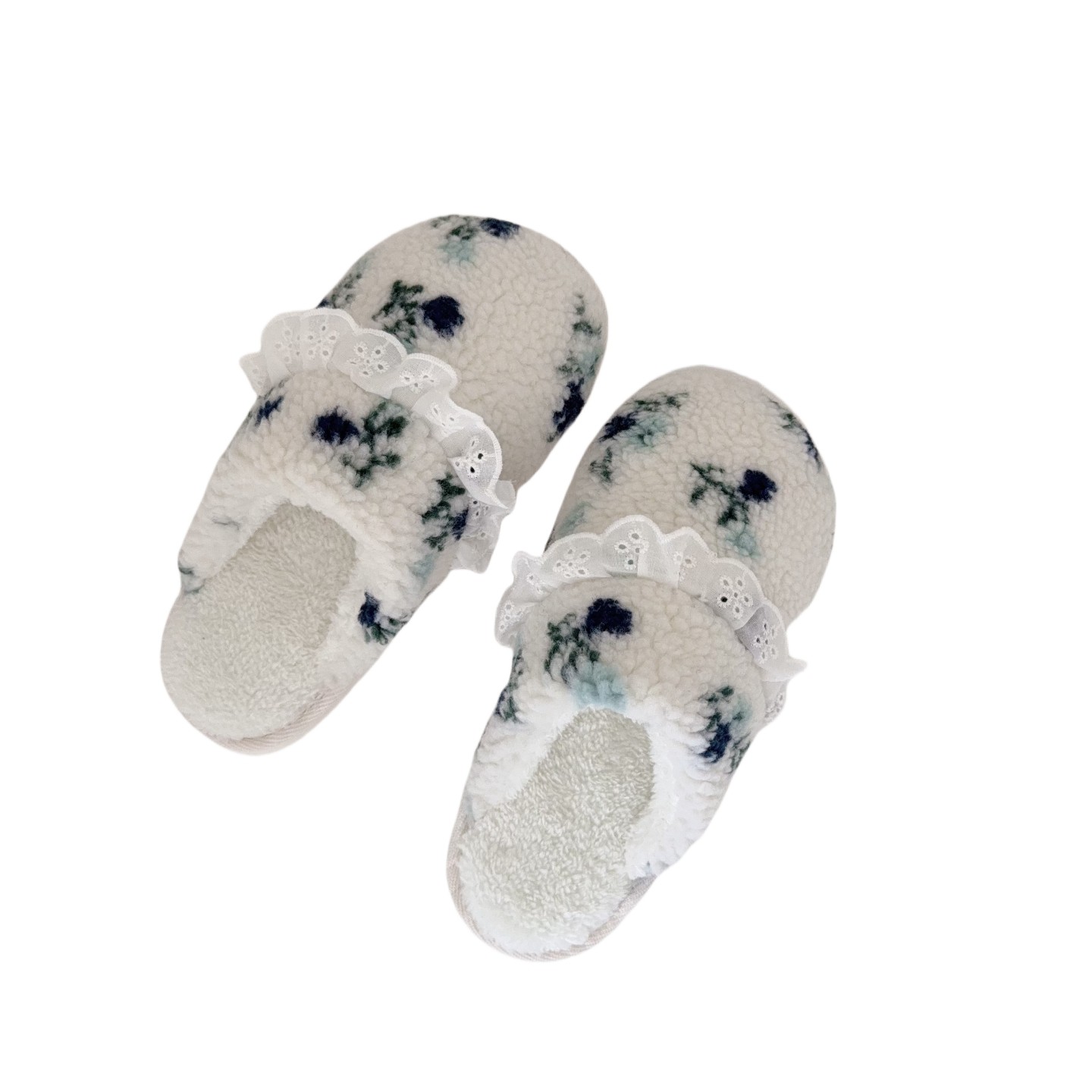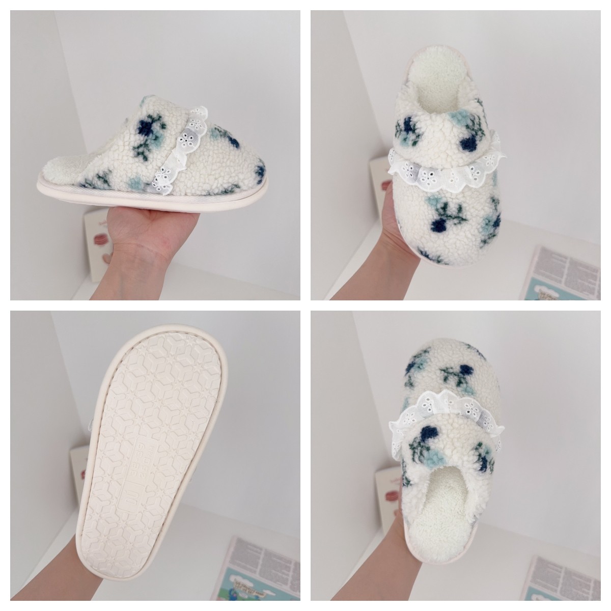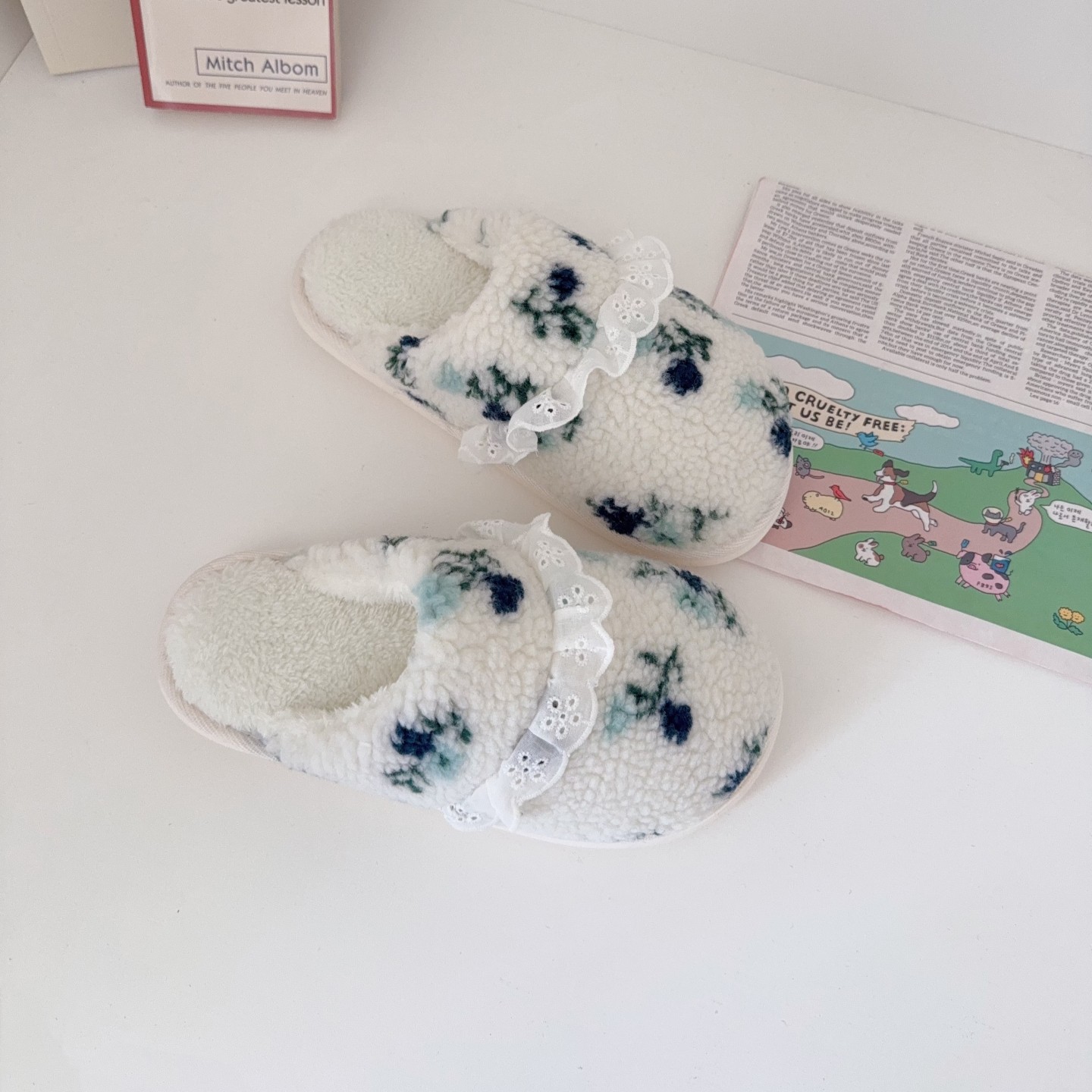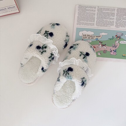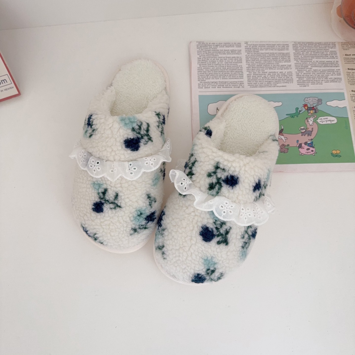 甜美花边公主风厚底棉拖鞋女冬季保暖居家鞋室内防滑地板毛毛拖鞋