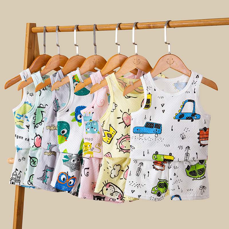 儿童背心套装纯棉网眼休闲卡通两件套宝宝薄款无袖男童女童套装夏