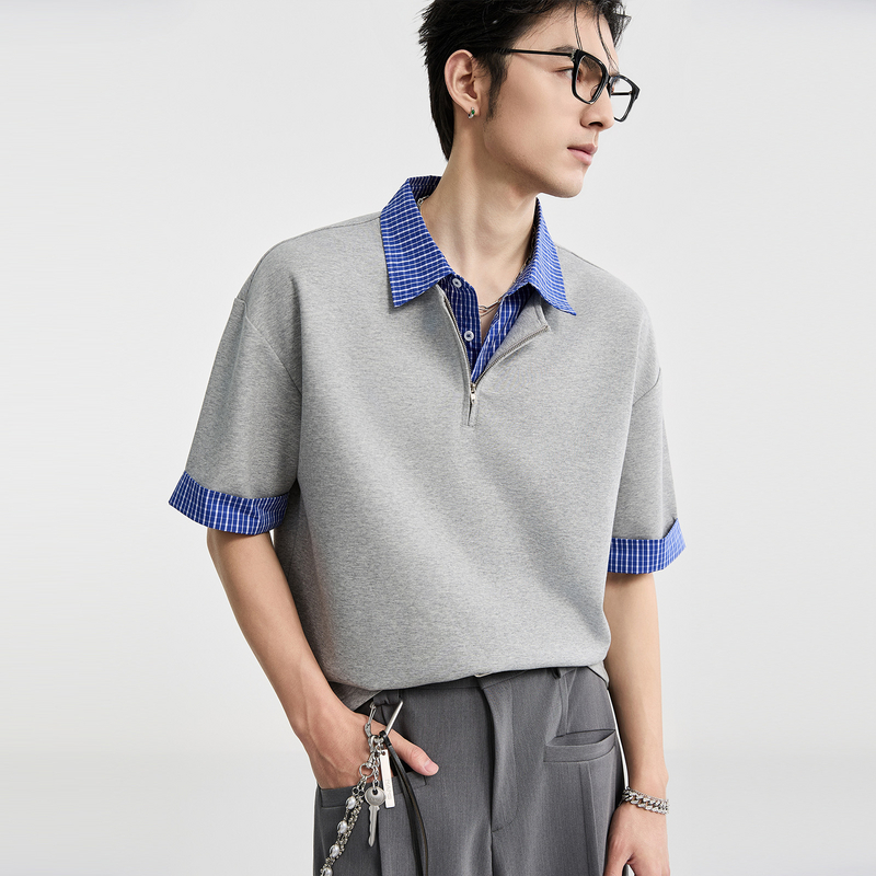 [撞色衬衫领假两件]伯爵先生男装2025夏季韩版宽松polo衫短袖体恤