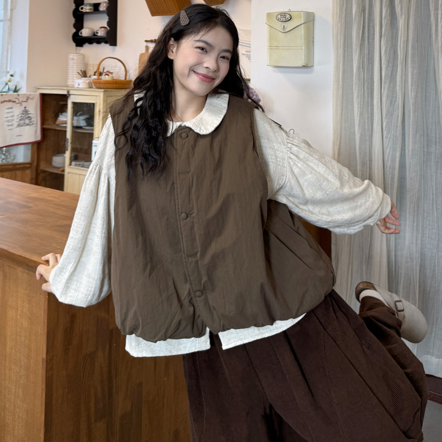 大码女装2025胖mm韩版娃娃领提花衬衫+百搭夹棉马甲+灯芯绒裤套装