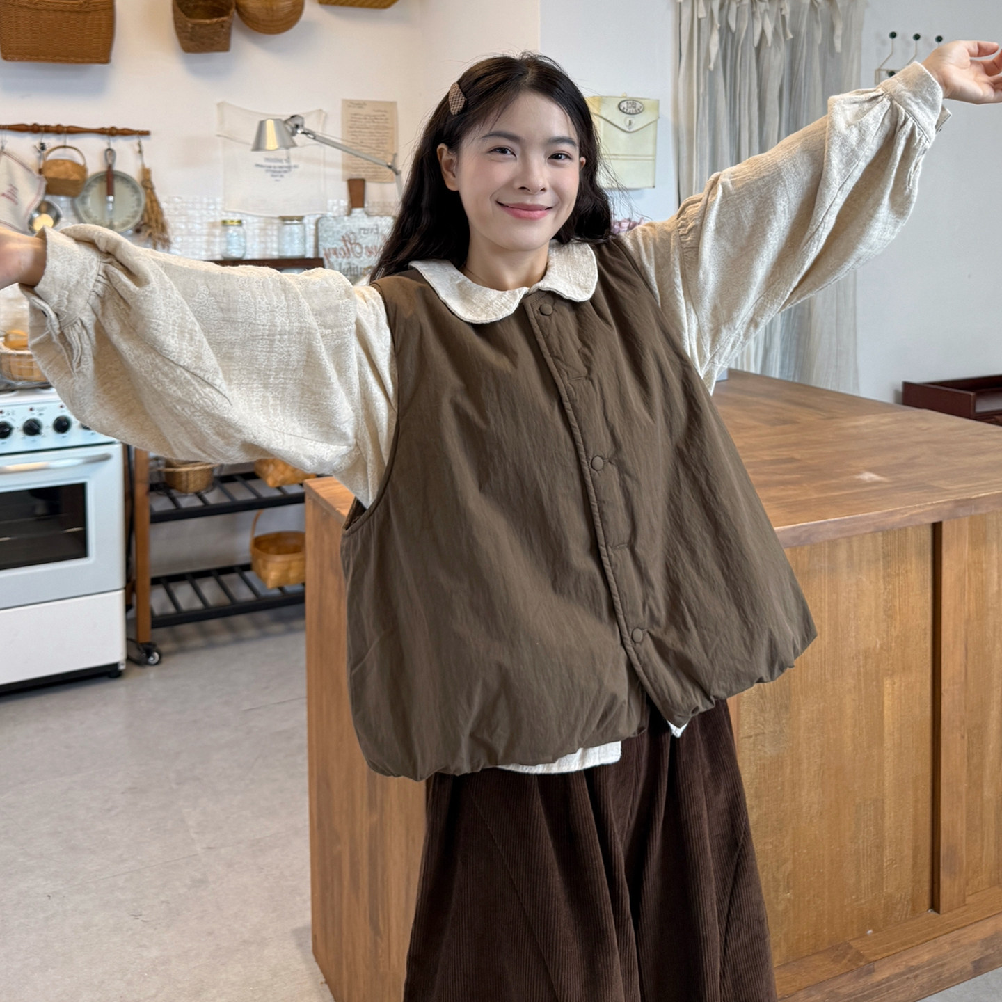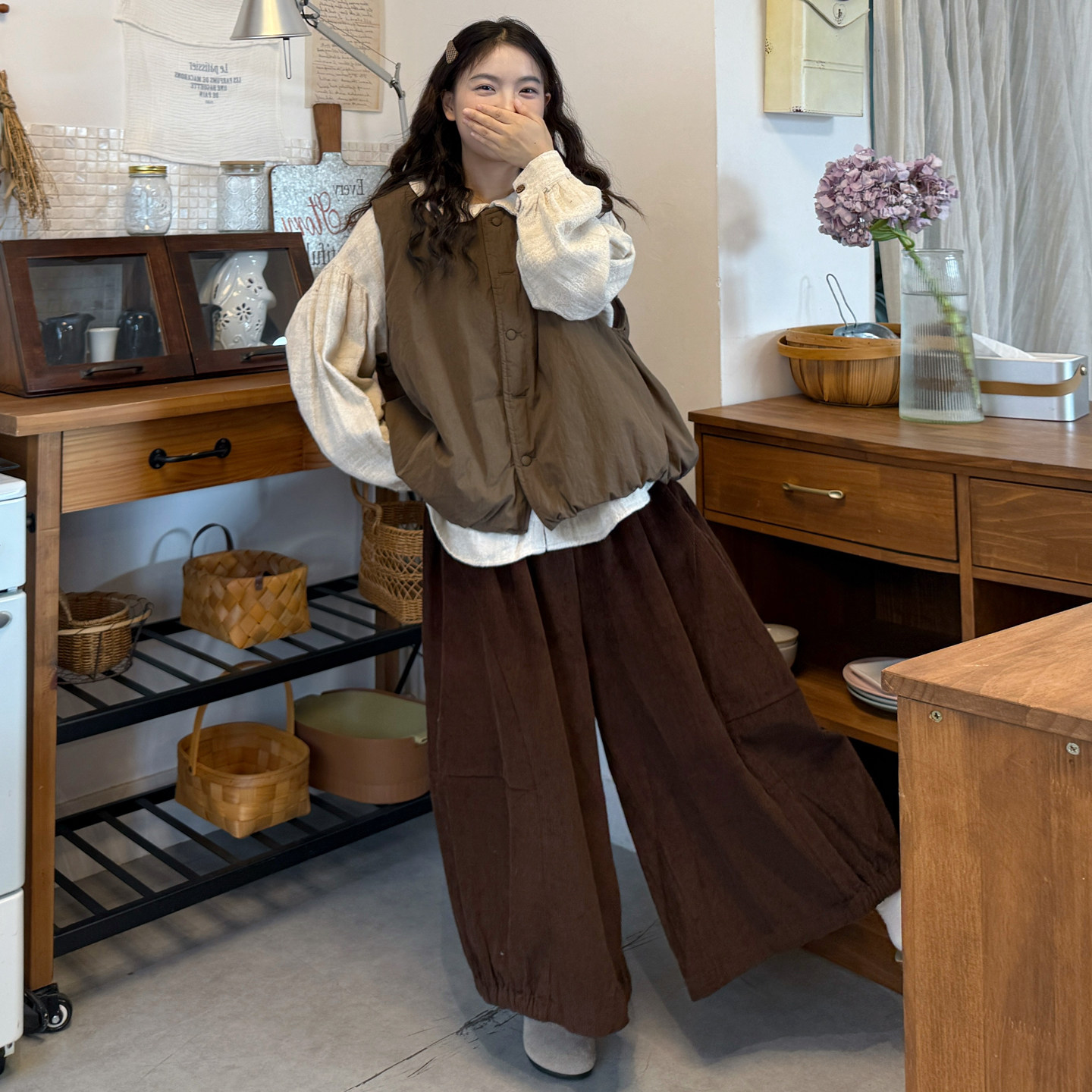 提花衬衫+夹棉马甲+灯芯绒裤套装