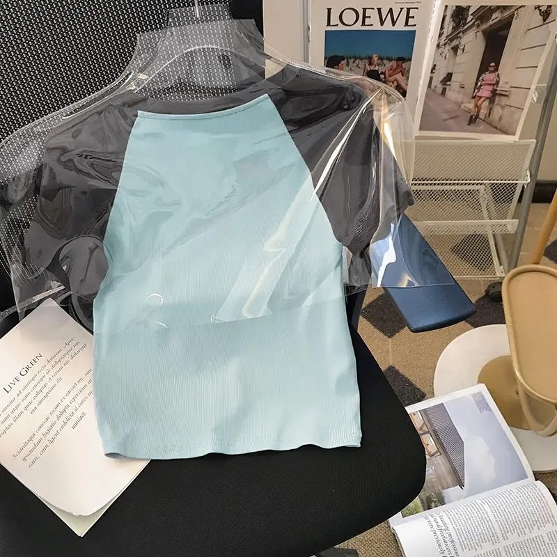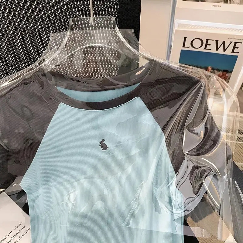 撞色拼接插肩短袖T恤女夏季短款辣妹设计感修身显瘦休闲百搭上衣