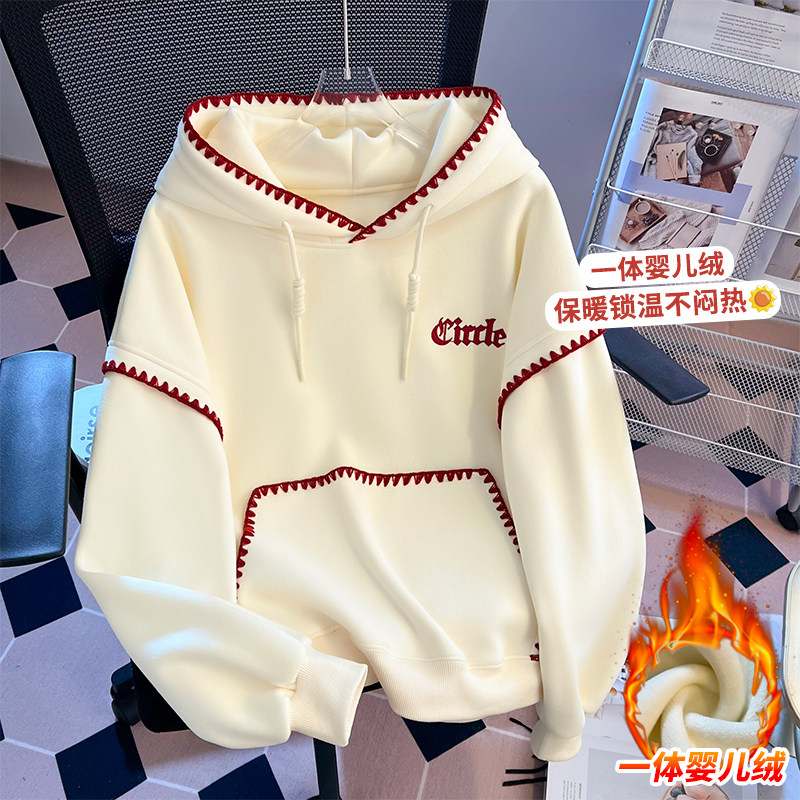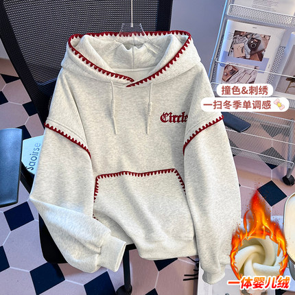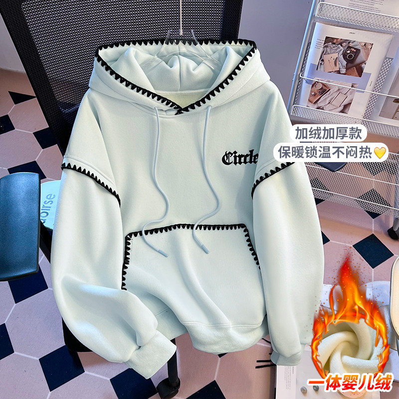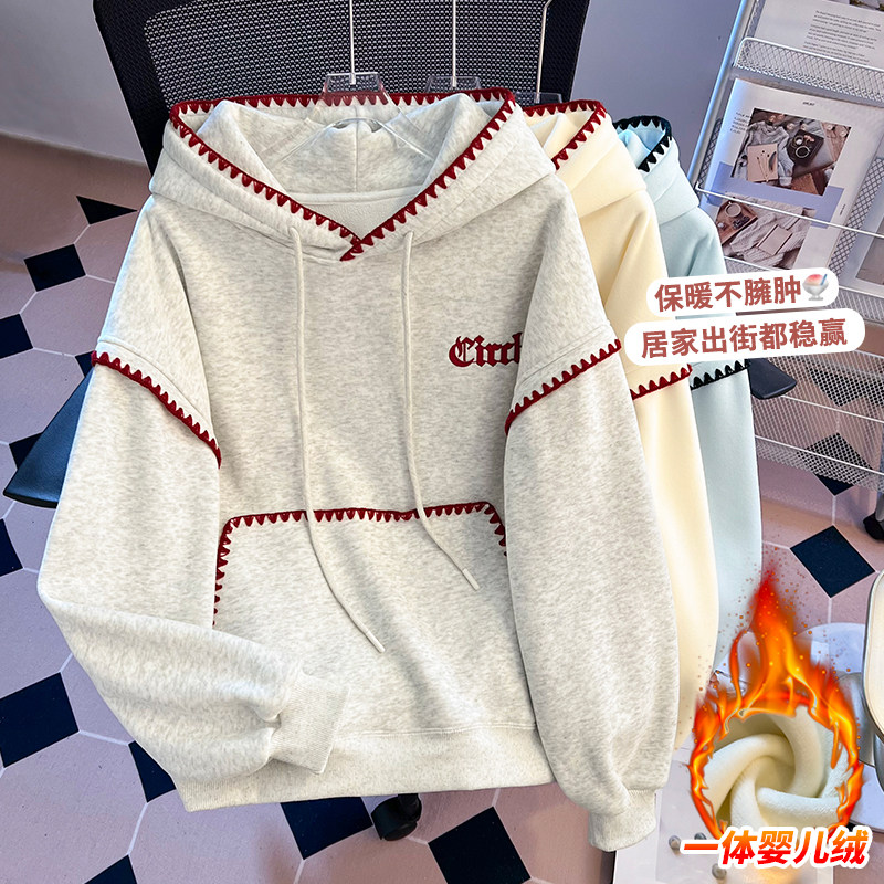 山东即墨大牌加绒加厚连帽卫衣女秋冬宽松字母刺绣休闲保暖上衣潮