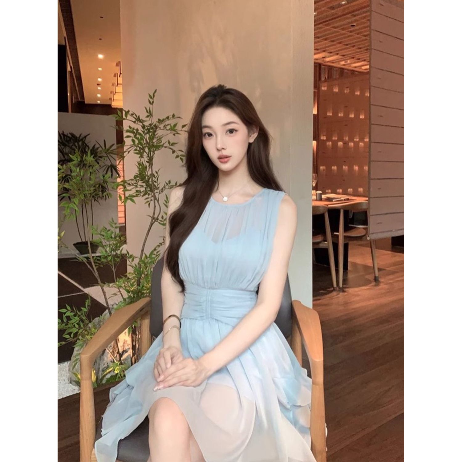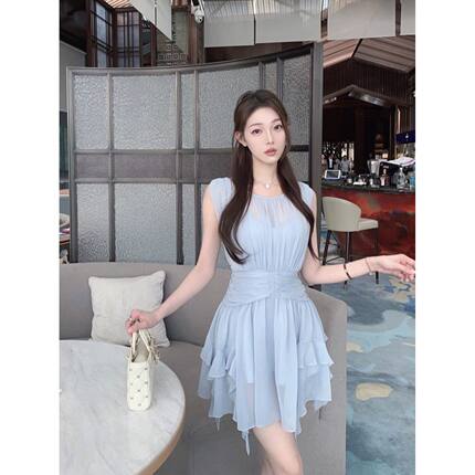 夏日海盐 2025新款夏装气质收腰短裙无袖温柔性感雪纺裙子连衣裙