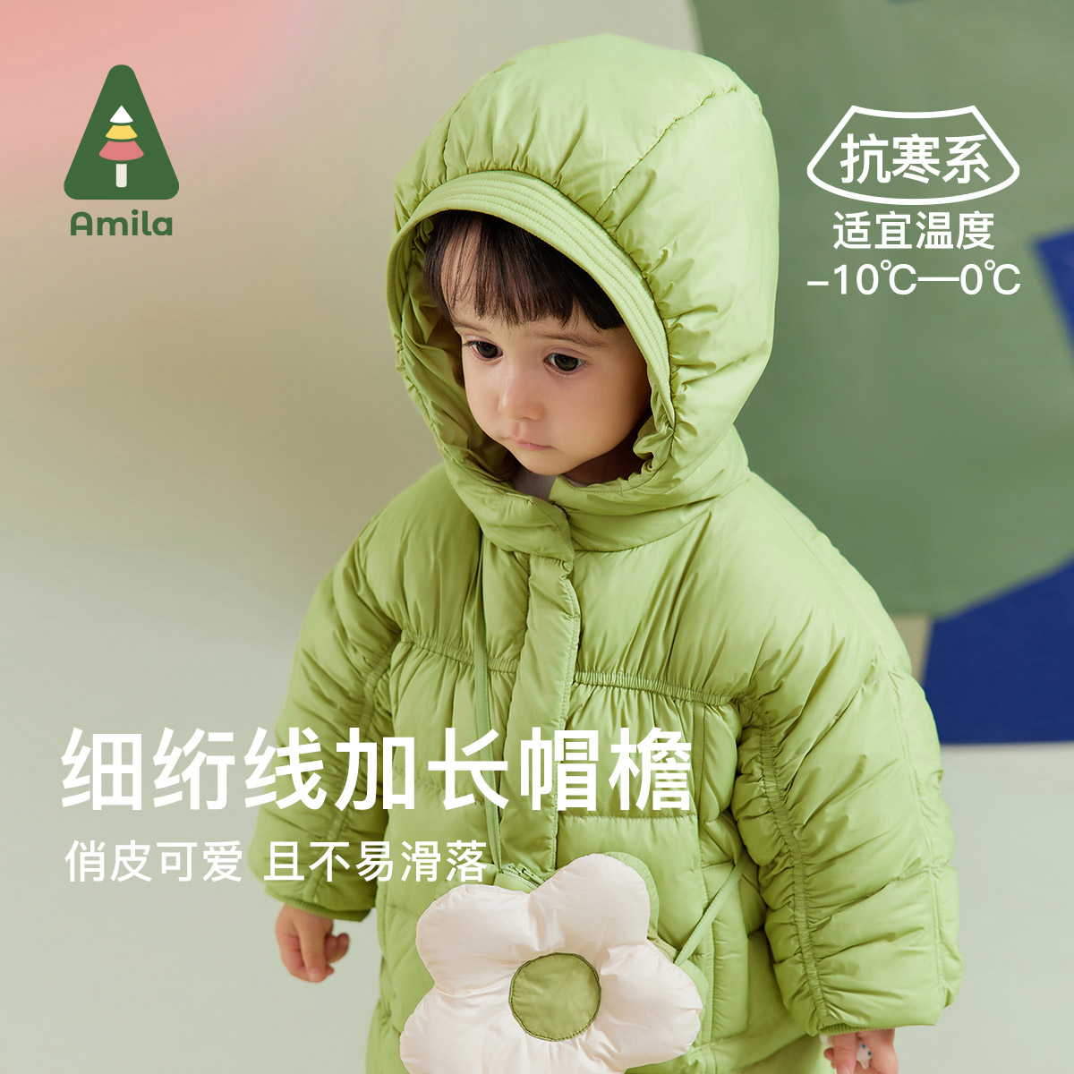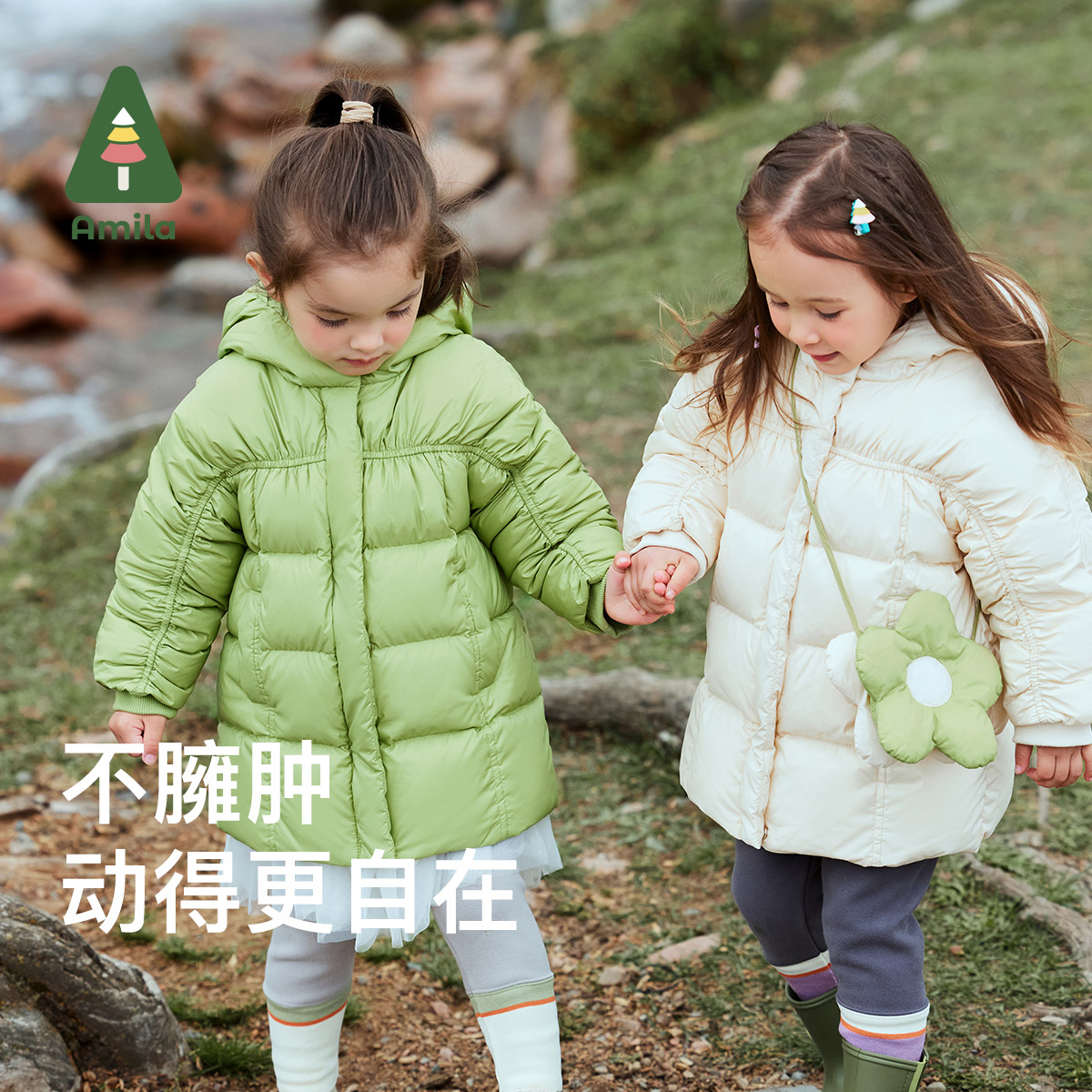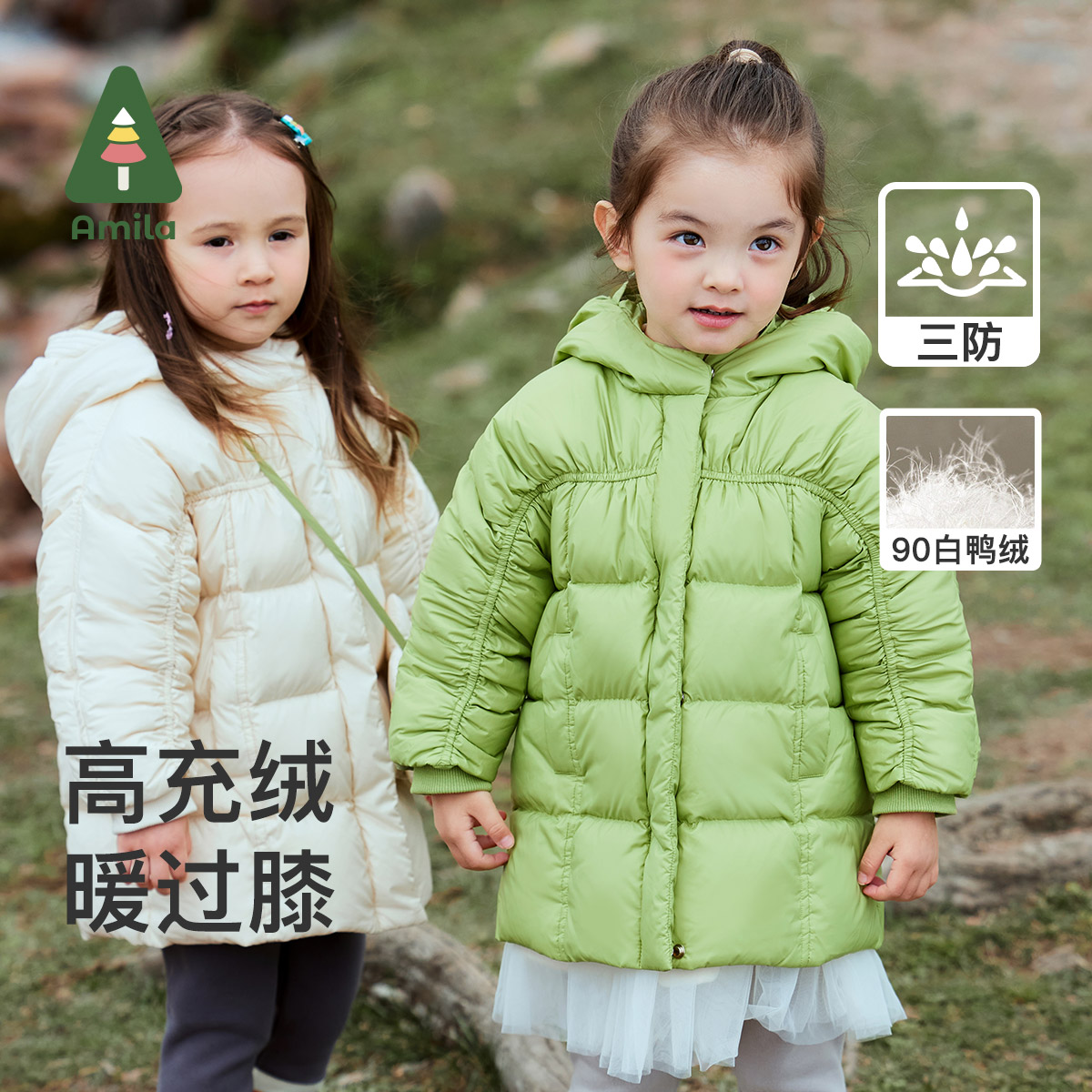 Amila女童三防免洗羽绒服中长款儿童宝宝冬装保暖加厚外套白鸭绒