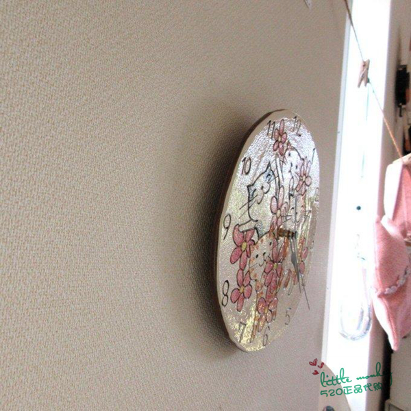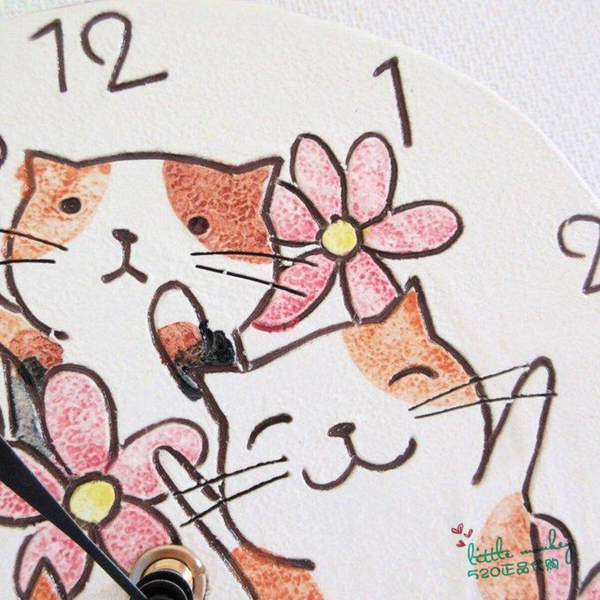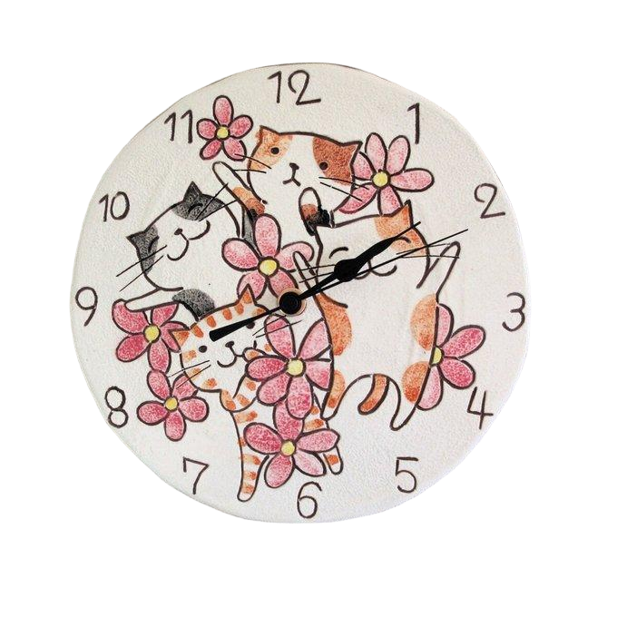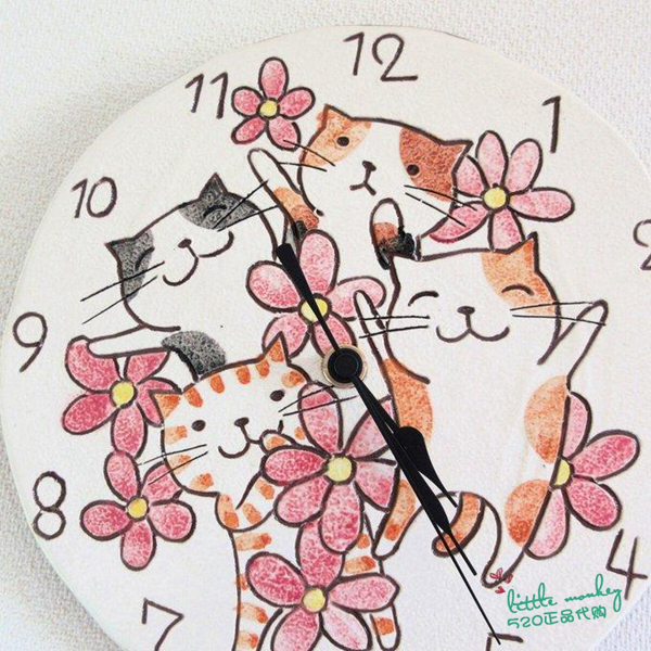 日本代购 快乐猫咪 花朵 匠人手工 陶制圆形装饰时钟 挂钟