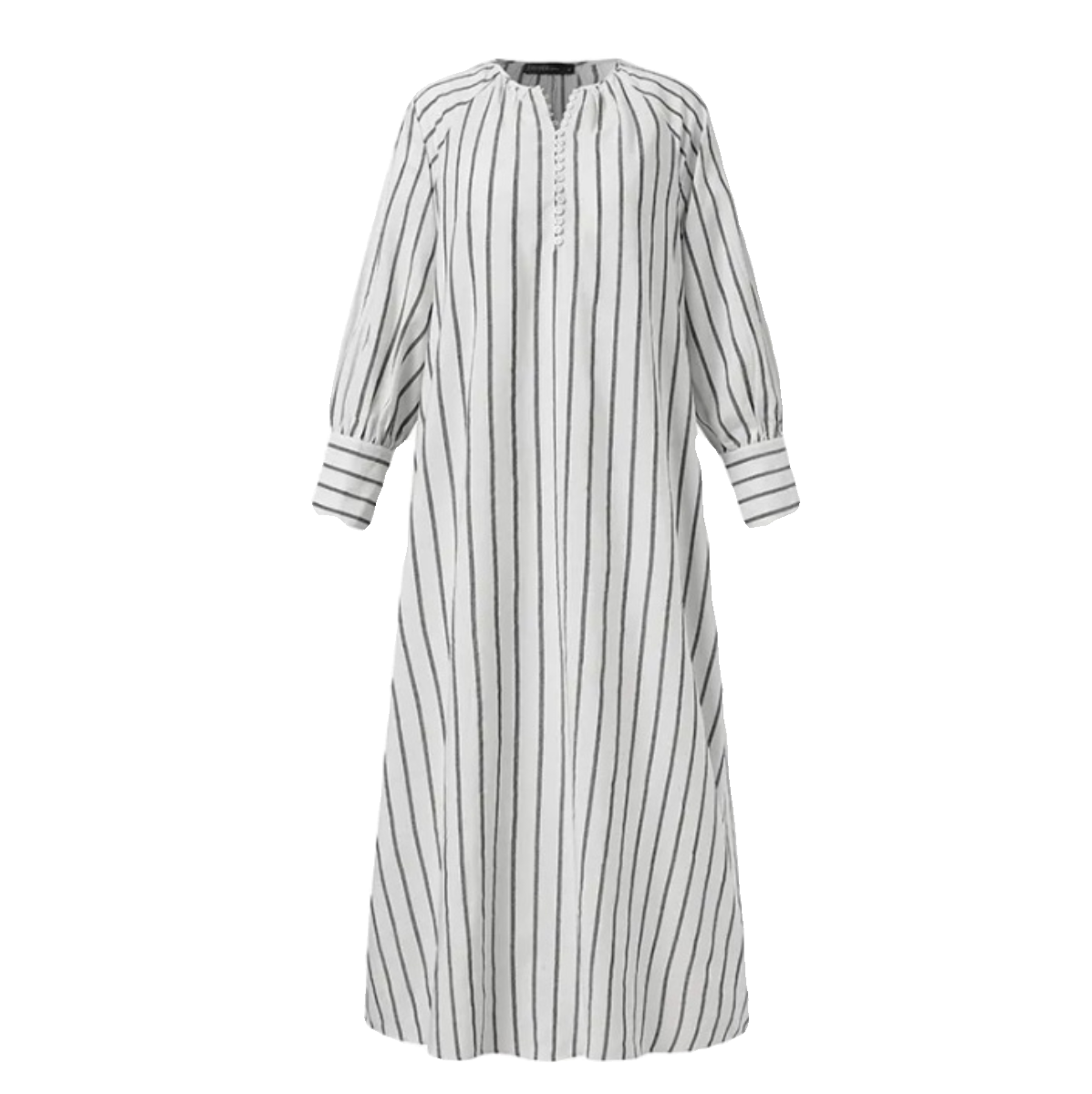欧洲站棉麻宽松连衣裙女秋长袖大码条纹纯亚麻超长款到脚踝衬衫裙