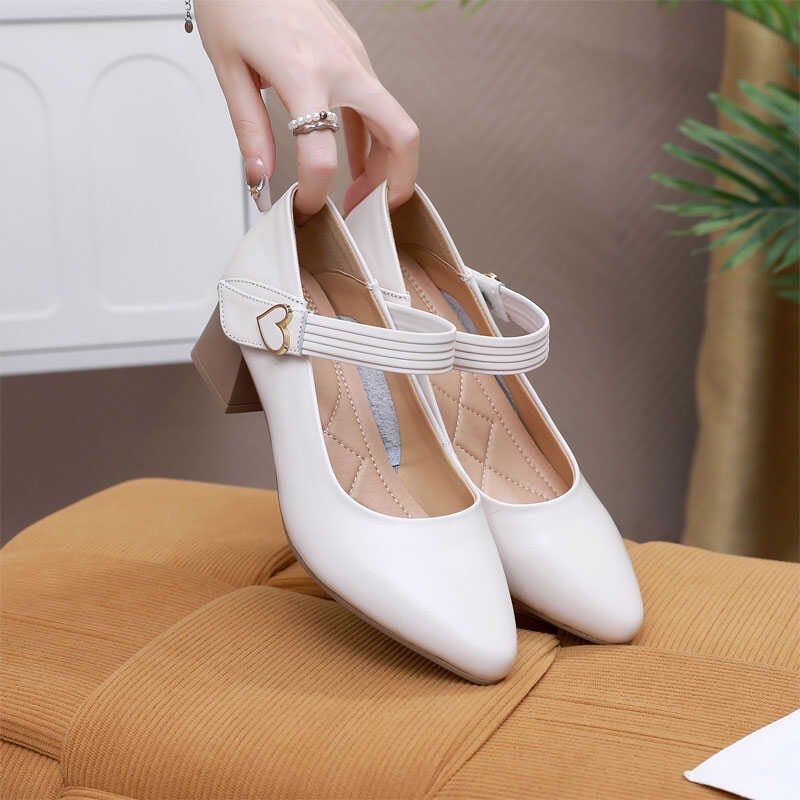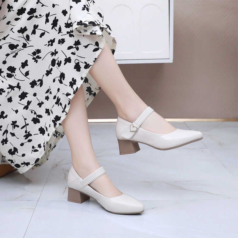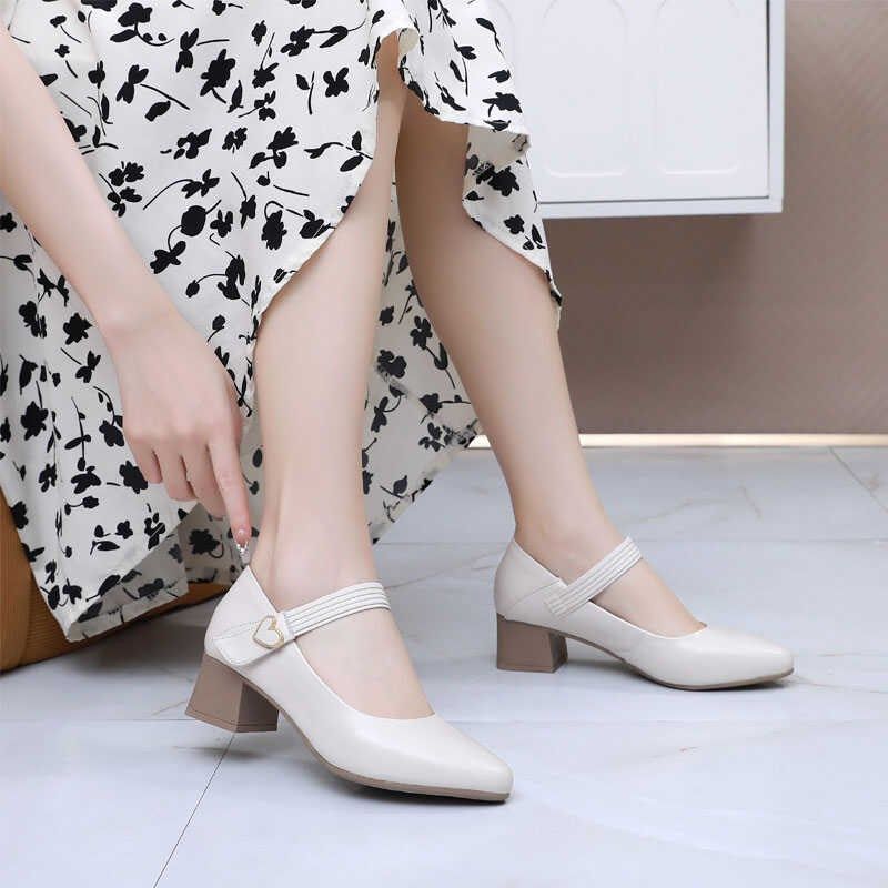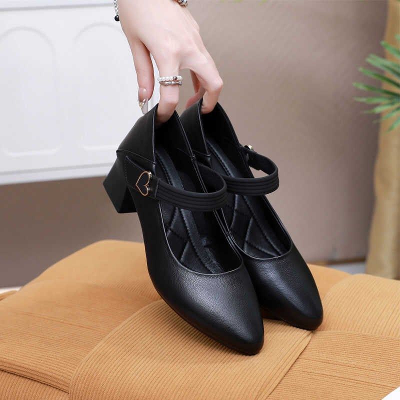 真皮浅口尖头中跟单鞋31 32 33小码牛皮粗跟软底舒适工作皮鞋女鞋
