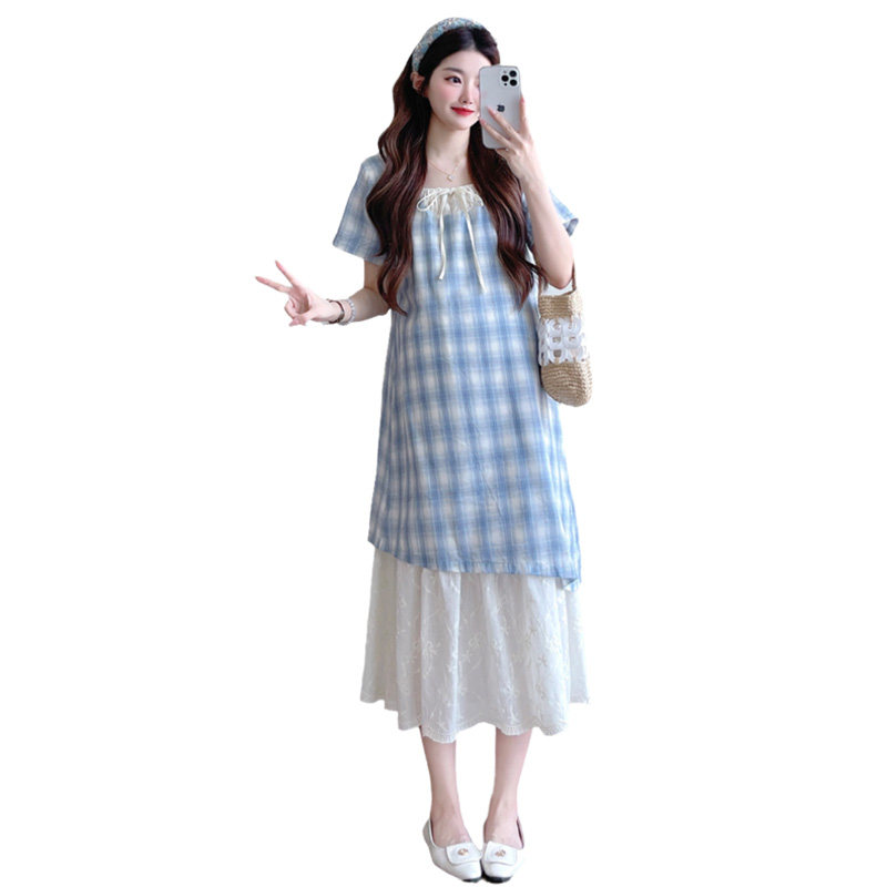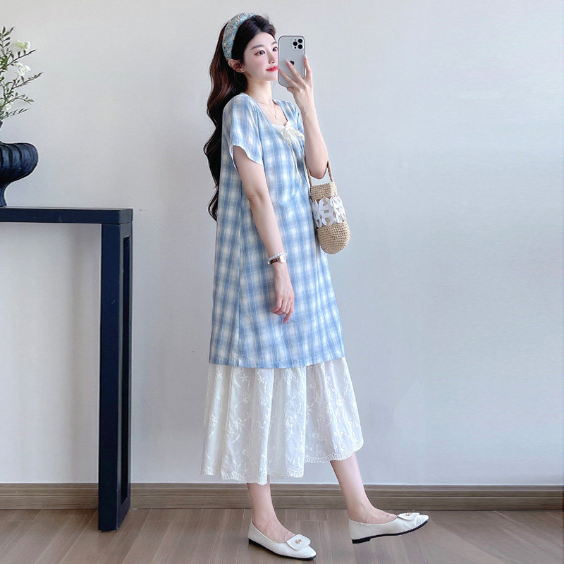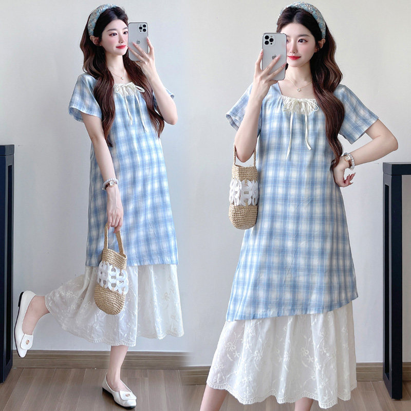 夏季孕妇连衣裙新款韩版孕妇装时尚拼接假两件中长款蕾丝格子裙子