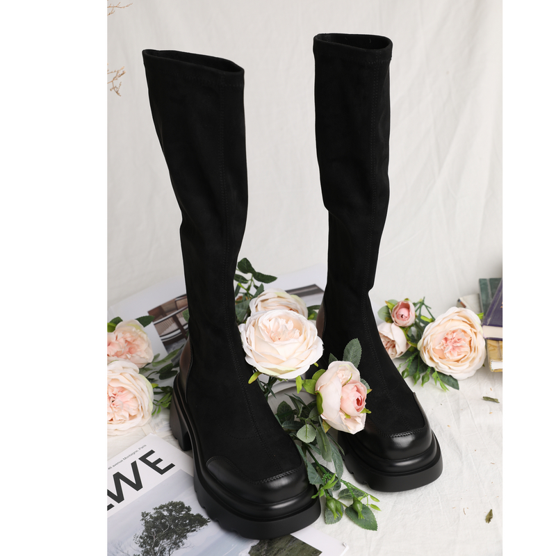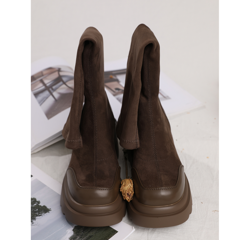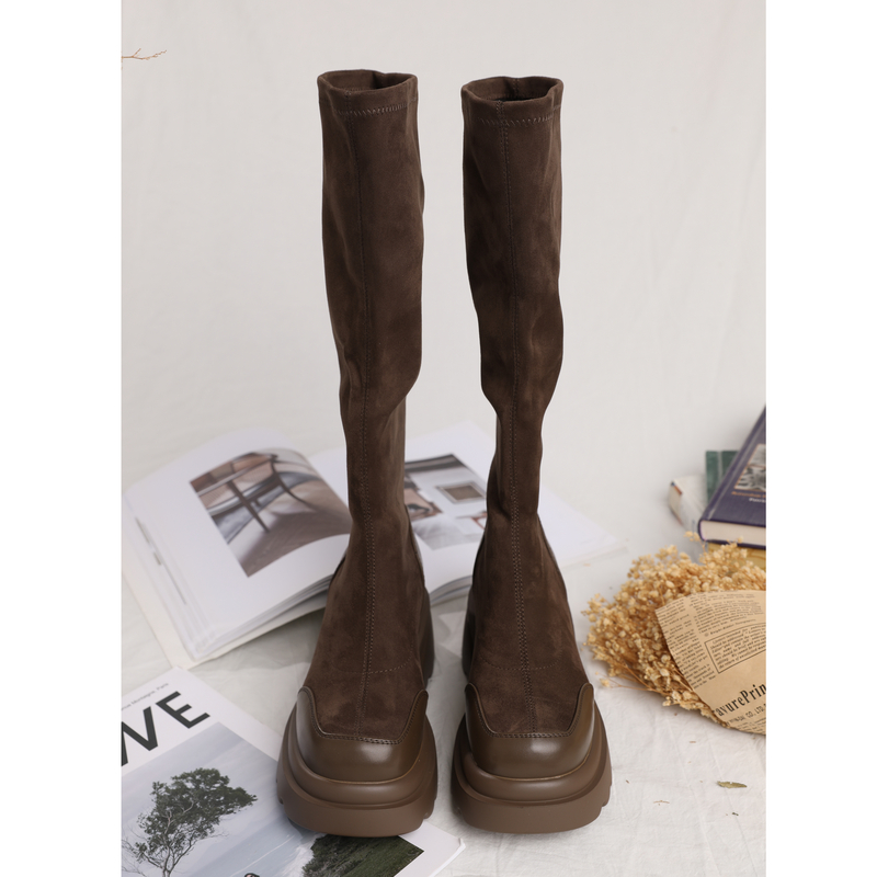西町村屋绒面拼接时尚高筒靴女