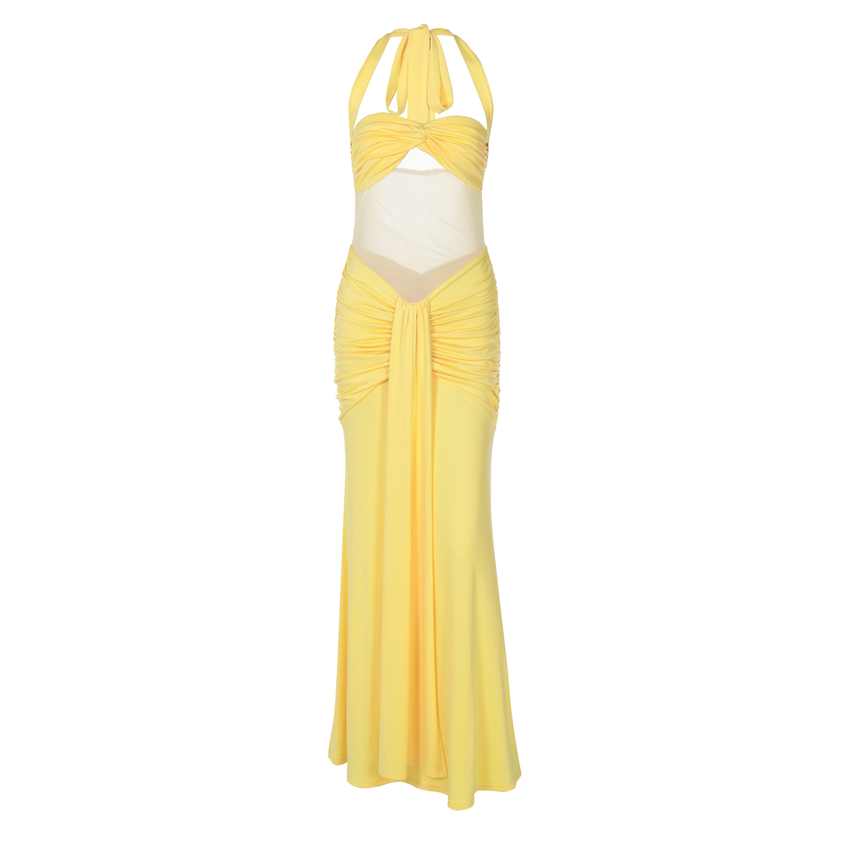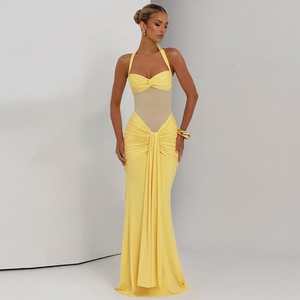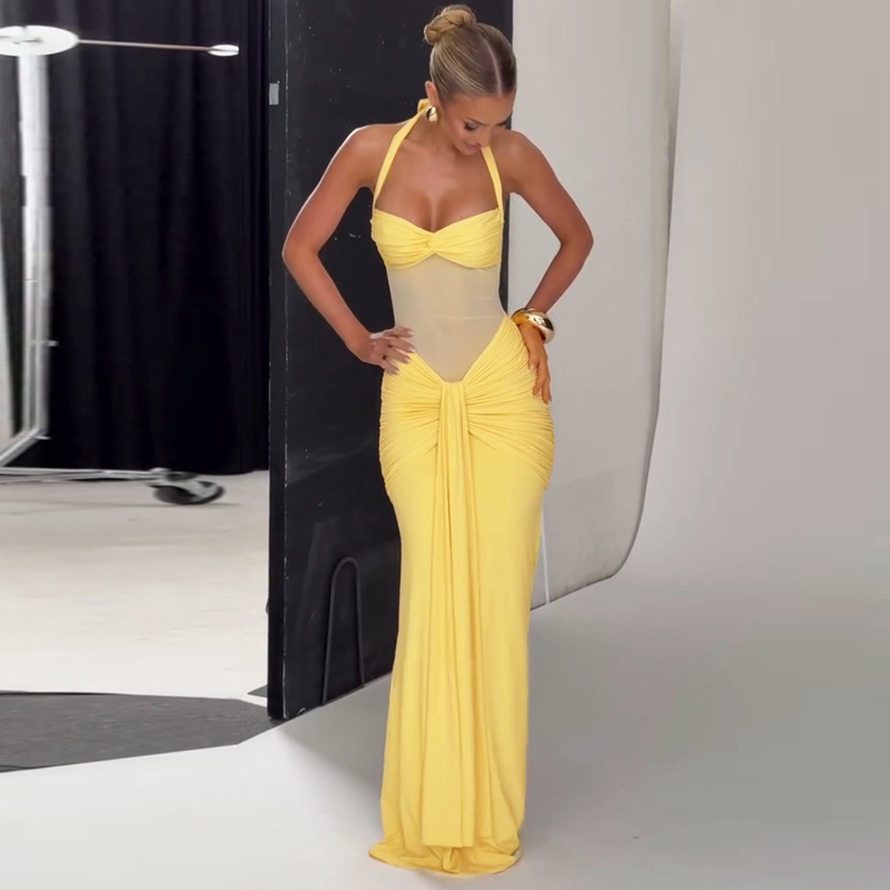 shemoda 欧美风性感网纱拼接露腰扭结一字领绑带挂脖吊带连衣裙女