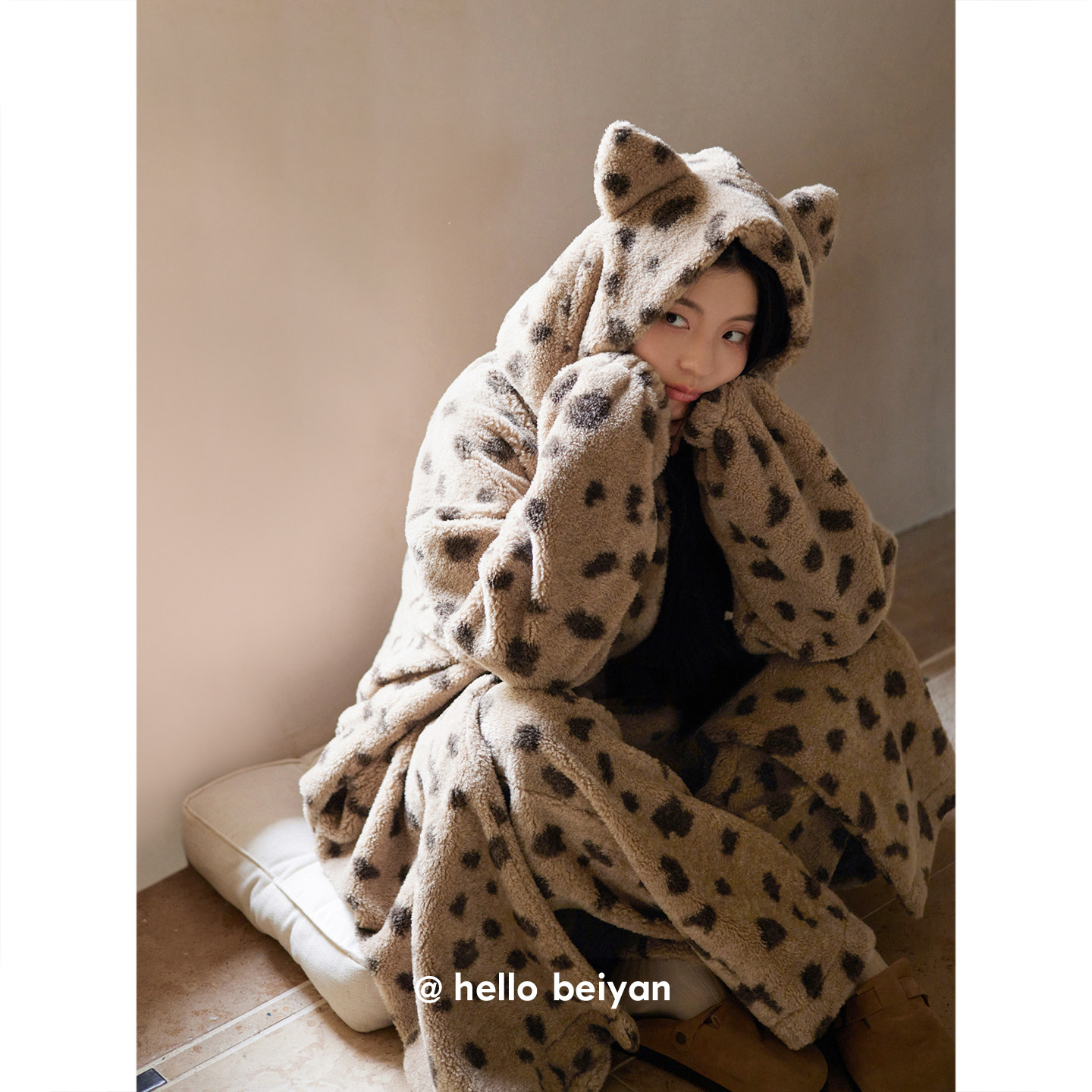 贝妍女冬连帽开衫加厚珊瑚绒睡衣