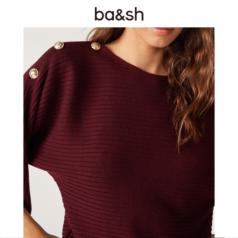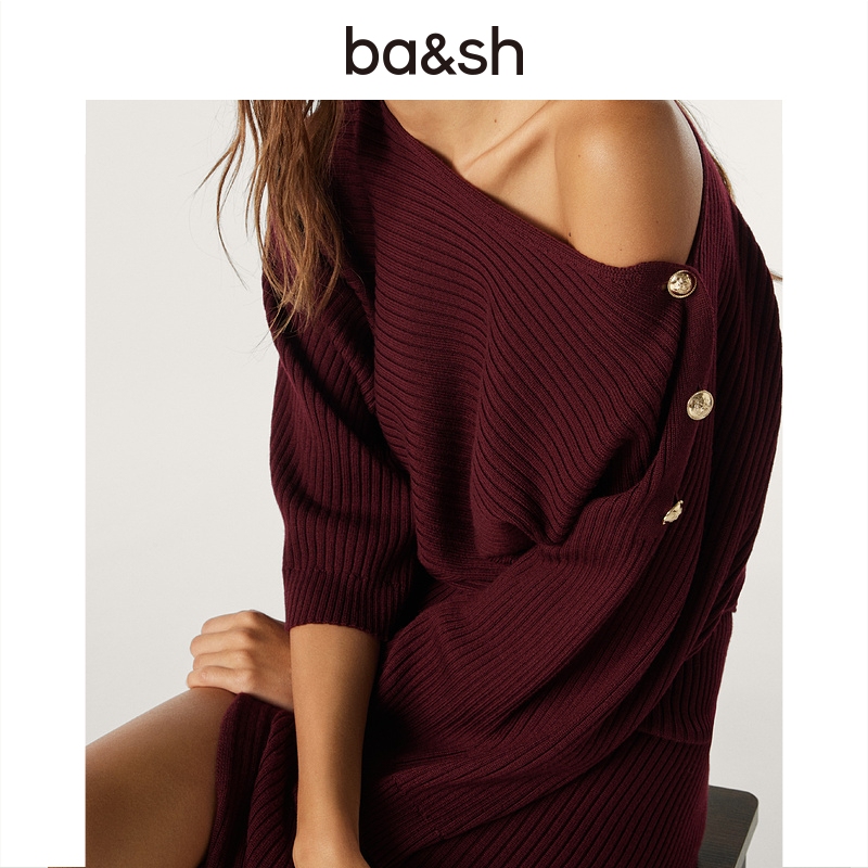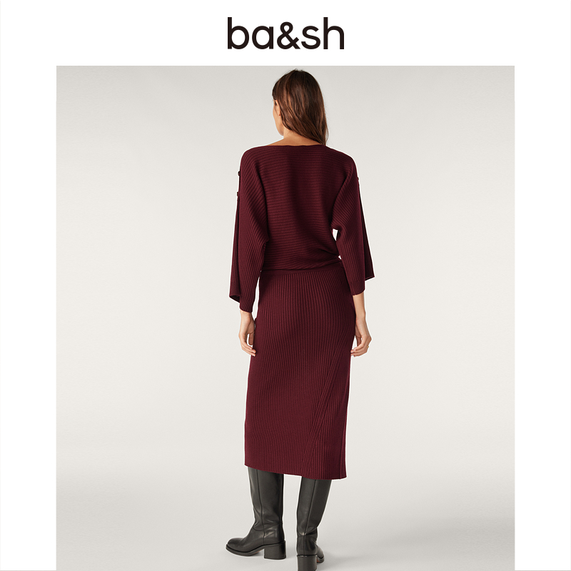bash秋季法式气质一字肩羊毛混纺安可拉红裹身针织连衣裙1H23RAHL